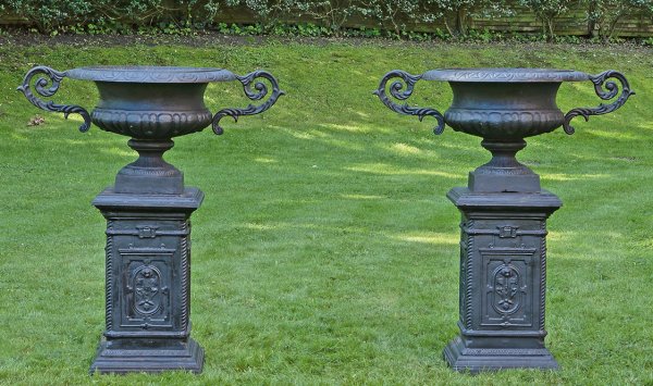 A pair of large French black lacquered cast iron garden vases with pedestal.