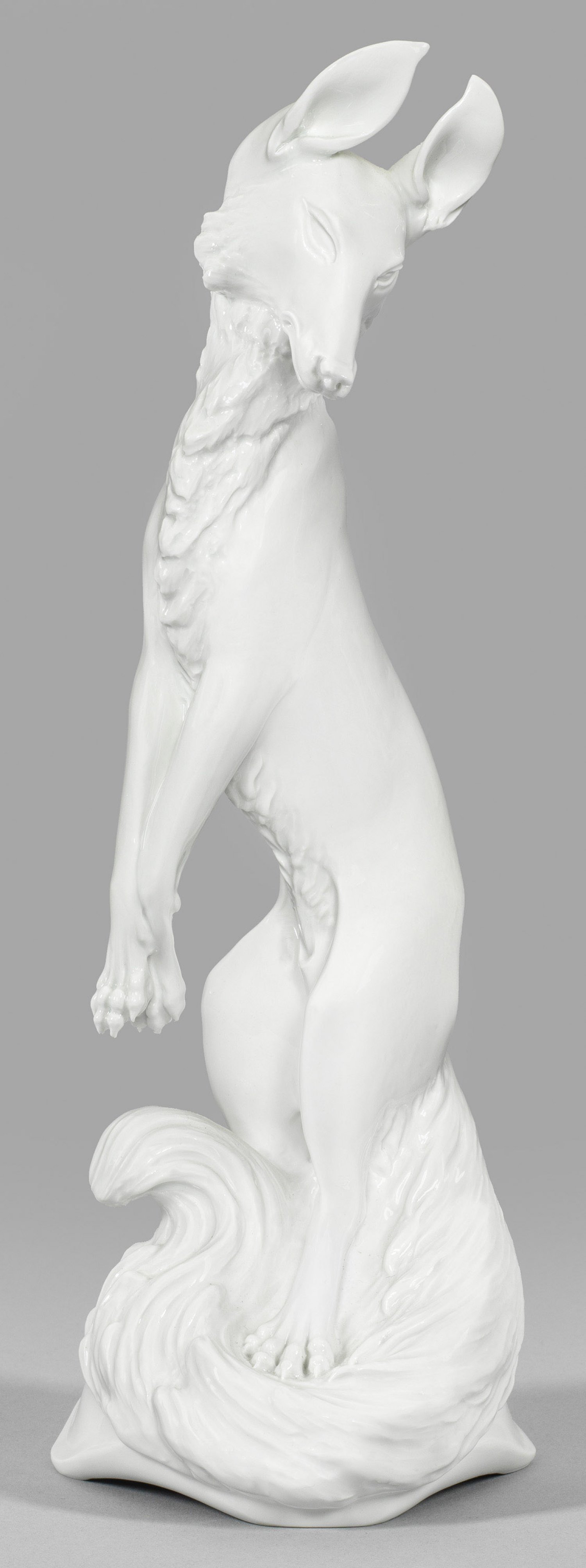 Auf einem vierpassig aufgewölbtem Sockel die dynamische Darstellung eines auf den Hinterläufen aufrecht tanzenden Fuchses. Der wellenförmige Schweif den Sockel umschmiegend. Weißporzellan. Entw. Max Esser, um 1922-1926. Modell-Nr. 78955. Limitierte Auflage 058/100. Jahreszeichen. Schwertermarke mit Goldsignet und Marke für Weißware. Beigefügt Zertifikat aus der Kollektion "Limitierte Meisterwerke". H. 34 cm.