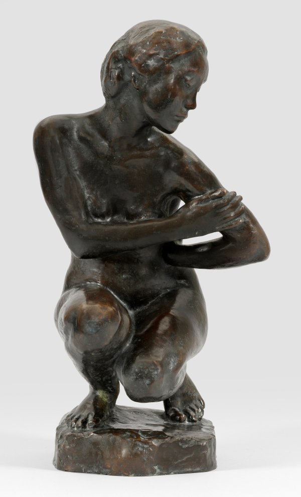 Bronze, dunkel patiniert, 1911. Monogr., "GK" in Ligatur, Gießerstempel "H. NOACK BERLIN", 1911. Guss wohl 1950er Jahre (vor 1972). Gesamtauflage ca. 19 Exemplare. Wvz.-Nr. W 11.024. Die "Japanerin" gehört zu den ersten erfolgreichen Figuren Kolbes, bevor er mit der "Tänzerin" 1912 seinen endgültigen Durchbruch erzielte, und ist zugleich eine der eindrücklichsten Plastiken seines Frühwerks. 1911 erstmals in der XXIII. Ausstellung der Berliner Secession gezeigt, fand sie sogleich großen Anklang. Modell stand eine Halbjapanerin, die sich als Tänzerin und Stummfilmschauspielerin "Taka-Taka" nannte. Kolbes "Japanerin" verbindet das zu dieser Zeit öfters vorkommende Motiv eines kauernden Aktes mit der Darstellung einer asiatischen Tänzerin, wie sie auch viele anderer Künstler faszinierte. Was diese "Japanerin" jedoch einzigartig neu werden ließ, war die in ihr gebündelte Harmonie, Anmut und Sinnlichkeit bei gleichzeitiger dynamischer, spannungsgeladener Bewegtheit im Raum, ihre Allansichtigkeit, die alle Vorzüge einer vollendeten Rundplastik vereint. Emil Waldmann hob die Plastik in seinem frühen Text über Kolbe schon 1916 explizit hervor: "Die Japanerin ist ein Werk von höchstem Reiz und feinster Empfindung, keusch im Gefühl und innig in den leisen Bewegungen. Eines jener Werke, bei denen etwas Neues plötzlich über einen Künstler hereinbricht, wo ihm die Augen plötzlich aufgehen und sein Schaffen etwas von der Begeisterung eines mit vollem Bewußtsein erlebten Frühlings wiederbekommt." H. 46,5 cm.