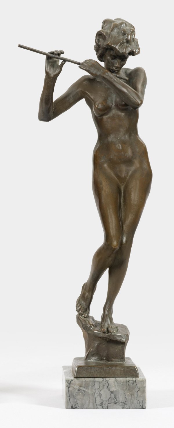 Bronze, dunkelbraun patiniert, 1941. Sign. u. dat.; Grauer Marmorsockel. Auf einem kleinen Felsen stehende Aktstatuette einer jungen Frau in graziöser Pose. Fahrner, der 1938 bis 1944 mit 20 Werken auf der Großen Deutschen Kunstausstellung war, schuf außer Kleinplastiken eine Reihe von größeren Werken für den öffentlichen Raum. Ges.-H. 37,8 cm.