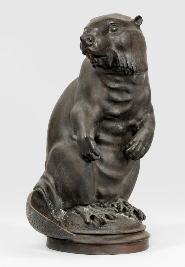 Bronze, schwarzbraun patiniert. Sign. "MAX ESSER", Gießerstempel "GUSS BARTH RINTELN". Eines von wahrscheinlich nur wenigen Exemplaren, der Guss erfolgte 1970 oder kurz danach im Auftrag des Sohnes des Künstlers Wolfram Esser (1924 - 2013) und seiner Frau Lilli Esser nach dem Originalmodell Essers von 1939 für die Staatliche Porzellanmanufaktur (KPM ) Berlin. Die moderne, auf das Wesentliche reduzierte und durch leichte Körperrotation dynamisch und allansichtig gestaltete Plastik spiegelt die große, schöpferische Meisterschaft des bedeutenden Tierbildhauers wider. Bereits um 1927 hatte Esser einen Biber in Bronze gießen lassen, den er 1936/37 als Figur für einen Brunnen überarbeitete und 1937 auch in der Großen Deutschen Kunstausstellung in München zeigte; 1939 folgte schließlich das Modell des Bibers für die Staatl. Porzellanmanufaktur (KPM) Berlin (Modell-Nr. 16.149). Max Esser studierte 1900-1903 an der renommierten Unterrichtsanstalt des Kunstgewerbemuseums sowie an der Kunstakademie in Berlin bei August Gaul, der sein Schwiegervater wurde und ihn nachhaltig prägte. Ab 1906 stellte Esser regelmäßig auf den Großen Berliner Kunstausstellungen aus. Seit 1908 war er als Modelleur für die Schwarzburger Werkstätten in Unterweißbach tätig; 1920 ging er nach Meißen, wo er bis 1931 in der Porzellanmanufaktur beschäftigt war, ab 1924 als Leiter eines Meisterateliers. Danach fertigte er u. a. Modelle für die Berliner Porzellanmanufaktur, Rosenthal und Hutschenreuther. 1937 wurde die mit dem Biber vergleichbarer Figur eines Fischotters aus der Meissener Manufaktur auf der Weltausstellung in Paris mit einer Goldmedaille ausgezeichnet. Ca. 56 cm x 36 cm x 42 cm.