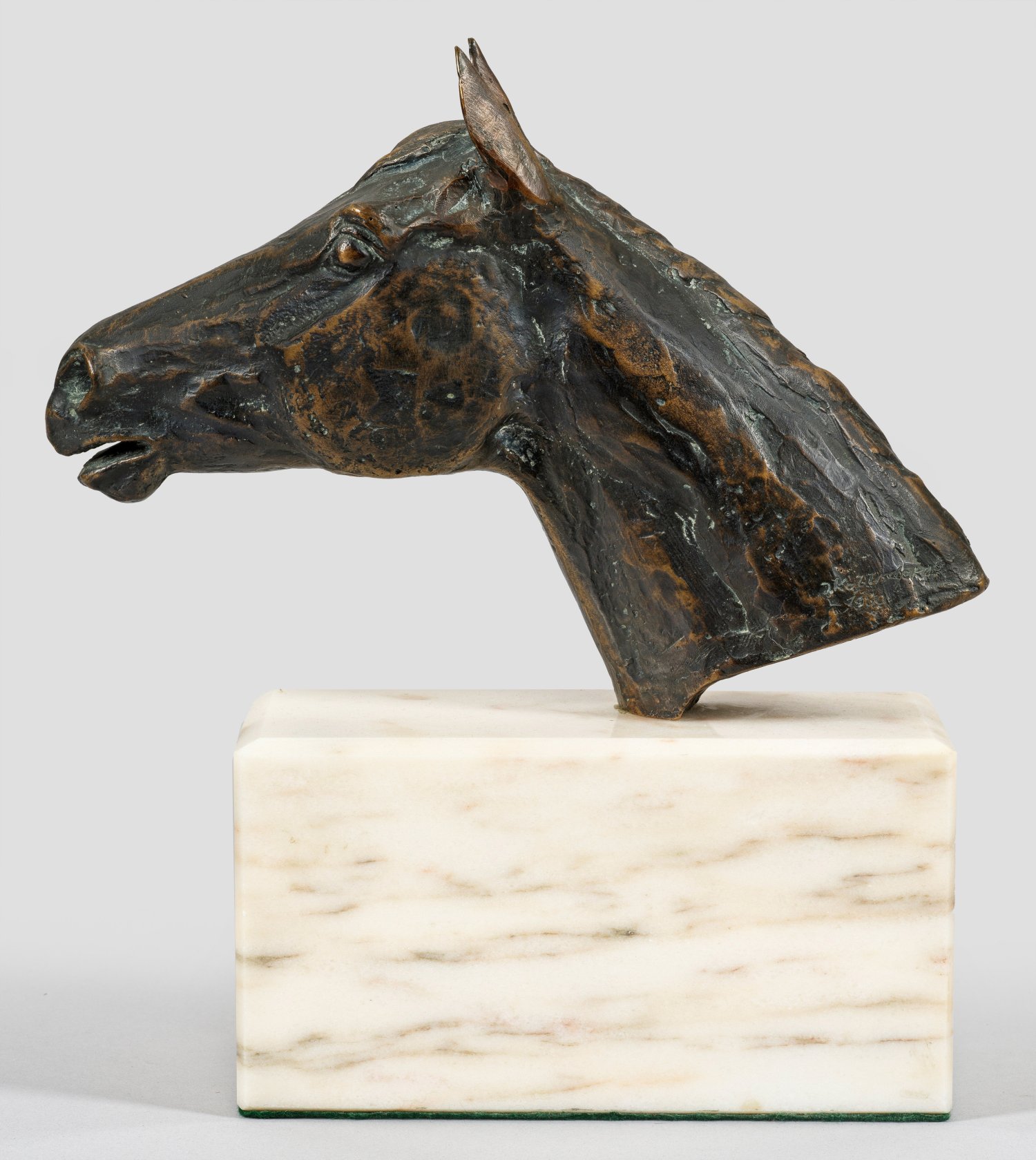 Bronze, dunkelbraun patiniert, 1980. Sign. u. dat.; Marmorsockel. Dargestellt ist der Kopf des legendären Englischen Vollbluthengstes "Nebos" (1976 - 1999), der 1980 zum Galopper des Jahres gekürt wurde. Ges.-H. 27 cm.