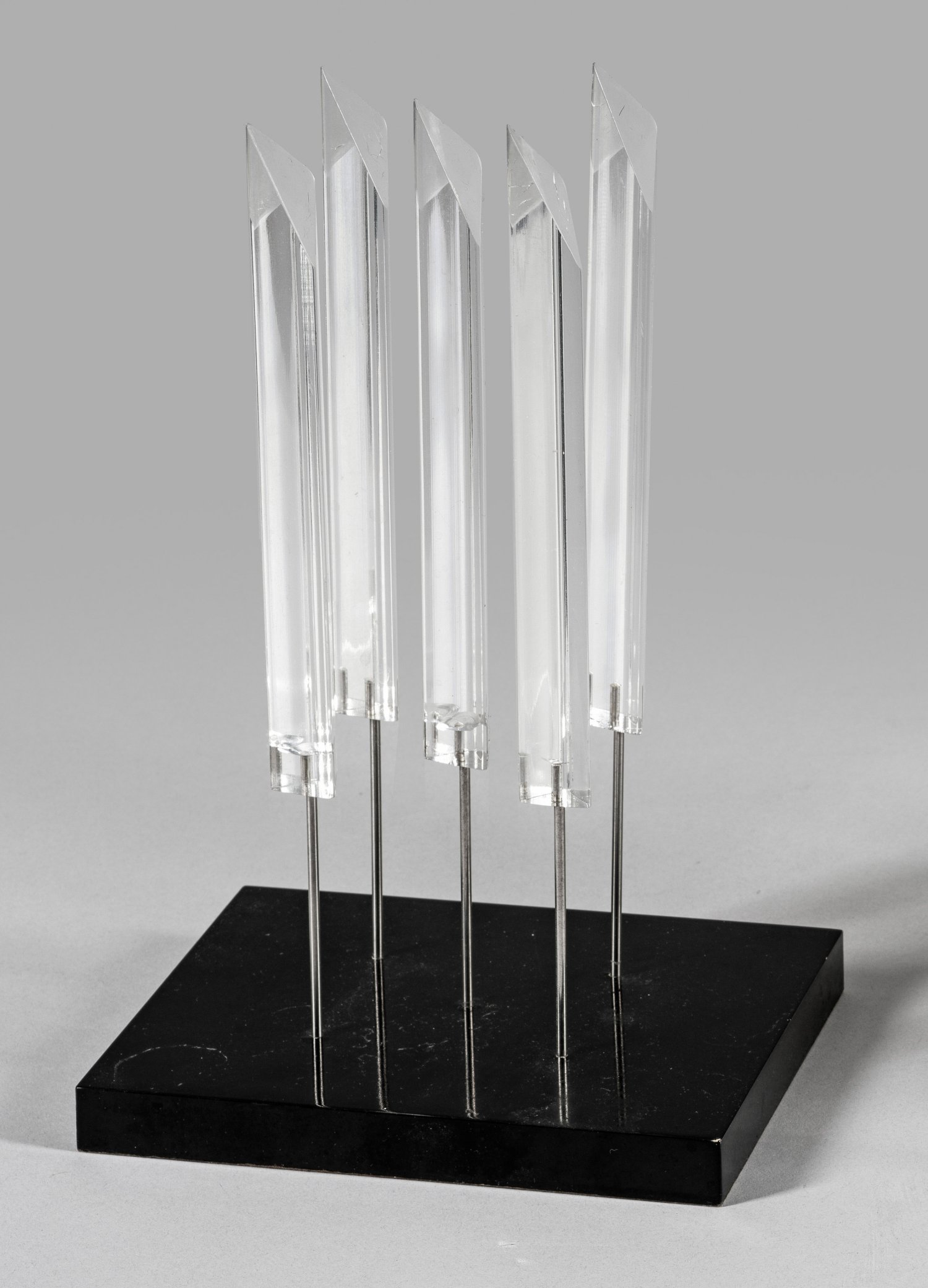 Fünf Acrylglas-Prismen mit Stahlstäben auf schwarz lackierter MDF-Platte, 1984. Multiple. Unterseitig Betitelung u. gedruckte Sign. auf einem Etikett. Ca. 29,5 cm x 18 cm x 13,5 cm.