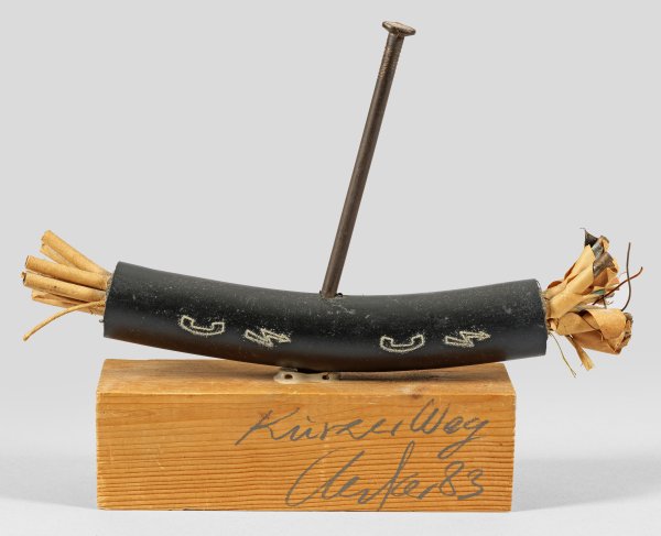 Stahlnagel in Fernmeldekabel (bzw. Telekommunikationskabel aus papierumwickelten Kupferkabeln in Hartgummischlauch) auf Nadelholzblock (Vierkantholz) montiert, 1983. Multiple. Mit Stempel-Sign., -Dat. u. -Betitelung auf einer der Längsseiten. Eines von 1500 unnummerierten Exemplaren. Ca. 22 cm x 27 cm x 5,5 cm.