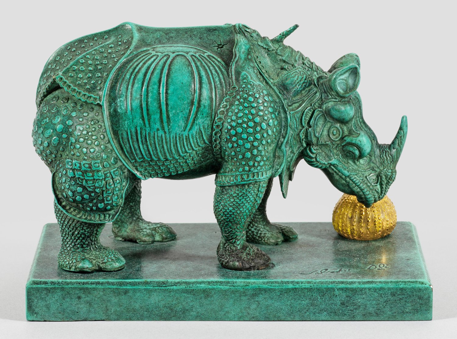 Bronze, grün patiniert, partiell vergoldet. Auf der Plinthe sign.; Posthumer Guss Airaindor (Valusani), Paris, 1997. Sign.; Gießerstempel mit Nummerierung u. Bez. "AIRAINDOR. 117. VF (=Vert Florentin)." Gesamtauflage 998 Exemplare. 11,2 cm x 16,2 cm x 9 cm. Plinthe minim. best.
