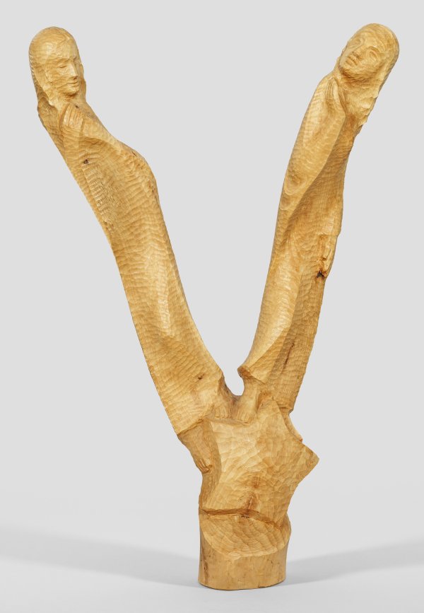 Lindenholz, geschnitzt mit sichtbar belassenen Bearbeitungsspuren. Sign.; Vollplastische, der Form einer Astgabel folgende, blockhaft stilisierte Darstellung zweier junger, auf einem Stern wandelnder Frauen. Dieses Werk spiegelt, wie ein Großteil seines Oeuvres, den prägenden Einfluss von Ernst Barlach auf Flath wider. Dieser studierte seit 1928 mit einem Stipendium in der Holzbildhauerklasse der Kunst- und Gewerbeschule Kiel bei den Professoren Schnoor und Blatzek, 1936 ließ er sich als freischaffender Künstler, Holzbildhauer und Maler in Bad Segeberg nieder. H. 103 cm.