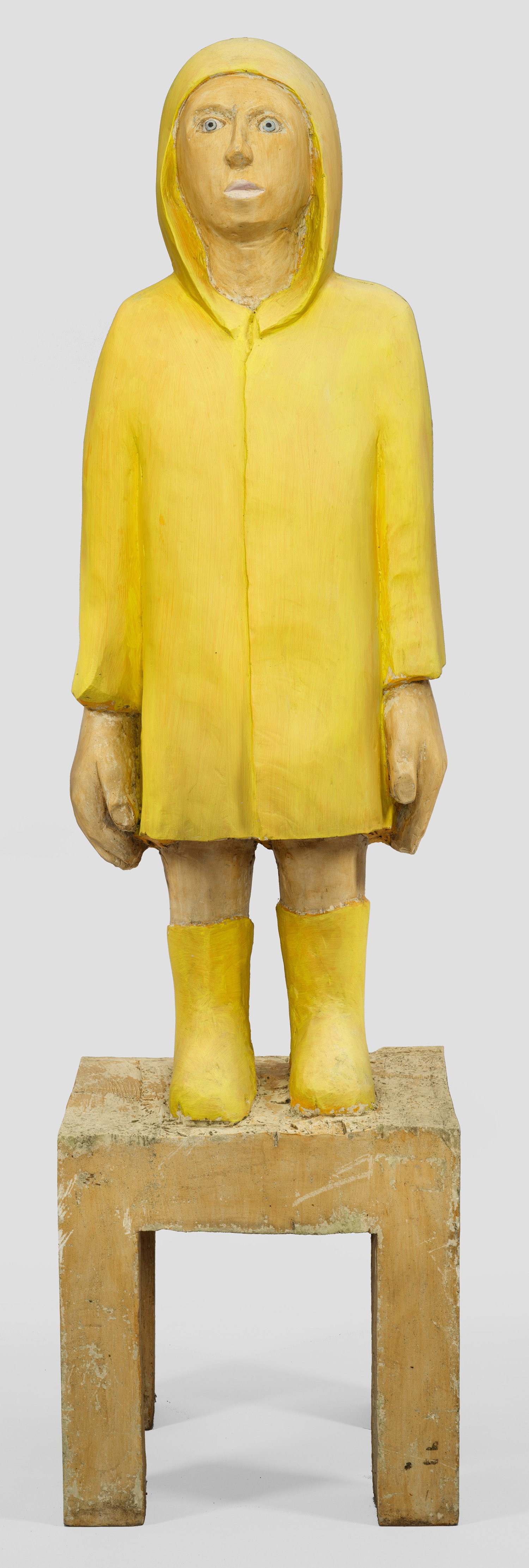 Lindenholz, gefasst. Ligatur-Monogramm "PH". Vollplastische, motiv- und stilcharakteristische Skulptur eines auf einem Hocker stehenden Jungen. Hermann studierte nach einer Steinmetzausbildung (1983-1986) von 1990 bis 1997 an der Hochschule für Künste in Bremen, 1996-1997 als Meisterschüler bei Bernd Altenstein. Seit 1993 stellte er vielfach in Museen, Kunstvereinen und Galerien in ganz Deutschland aus. H. 146 cm.