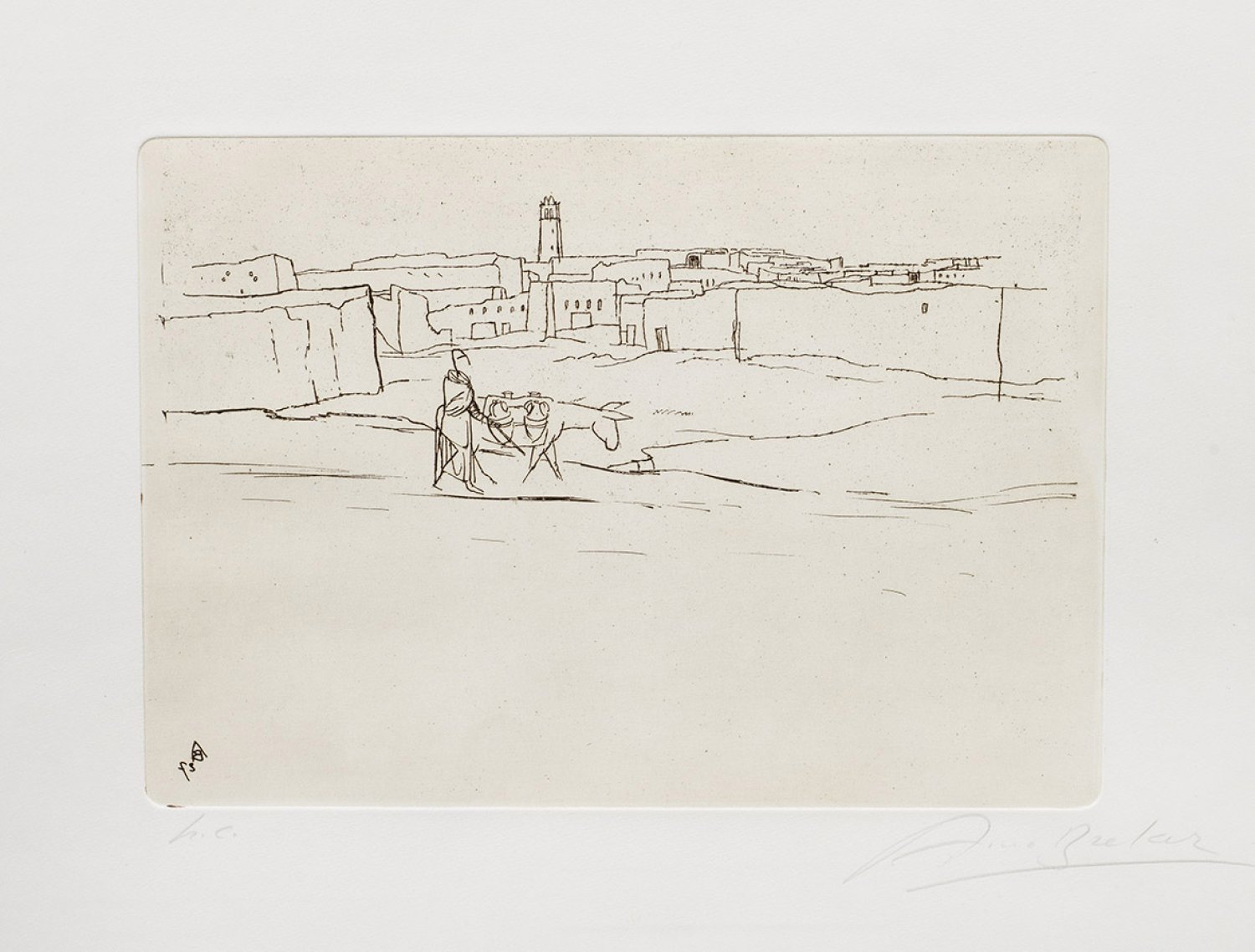 Radierung/Papier. Sign, "H.C."-Exemplar. In der Platte monogr.; Südliche, wohl nordafrikanische Landschaft, im Vordergrund ein Mann mit Esel. Plattenmaß ca. 24,2 x 34,4 cm. Rahmen.