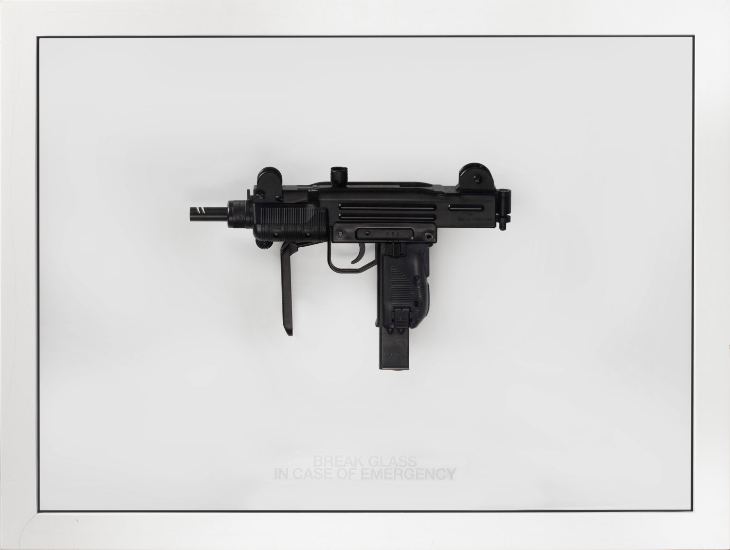 Black lacquered steel fake "Uzi" framed behind glass with white lettering mounted in a display frame, 2008. Signed, dated and titled on the reverse. Aside from the edition of 7 + 1 AP.
