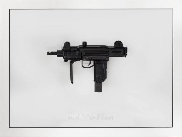 Schwarz lackierter Stahl, original montiert hinter Glas mit weißem Schriftzug "BREAK GLASS IN CASE OF EMERGENCY" in weißem Objektkastenrahmen, 2008. Verso sign., dat. u. betitelt. Außerhalb der Auflage von 7 + 1 AP. Die Arbeit ist ein markantes Beispiel für die ironisch hintergründige Aneignung "funktionaler" Objekte durch Anemic, in diesem Fall einer äußerst realistischen Replik einer "Uzi"-Maschinenpistole. Indem er diese hinter Glas mit einer Notfallanweisung verschließt, bringt er sie als Paradox in einen Zusammenhang mit Objekten, die sonst Leben retten oder Fluchtmöglichkeiten eröffnen. Hierdurch ruft der aus dem ursprünglichen Kontext gelöste Gegenstand als Kunstobjekt in vitrinenartiger Hülle weitere Assoziationen hervor, steht Anemic in der Tradition der Dadaisten und Surrealisten - Marcel Duchamp, Man Ray und Meret Oppheim. Anemic, der 1999-2005 ursprünglich Kommunikationsdesign studierte, arbeitet scharfsinnig konzeptuell in den Bereichen Bildhauerei, Malerei, Fotografie und Design, verbindet diese mit Sprache - auch als Neon-Leuchtschriften und greift hierbei auch auf Populärkultur und Pop Art zurück. Seit 2003 hatte er zahlreiche Einzel- und Gruppenausstellungen, seine Werke befinden sich in einigen der bedeutendsten internationalen Sammlungen, u. a. der Daimler Collection of Contemporary Art und des Musée Jenisch in Vevey. 59,5 cm x 80 cm x 8,5 cm.