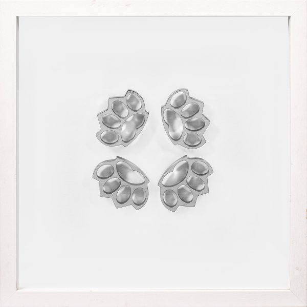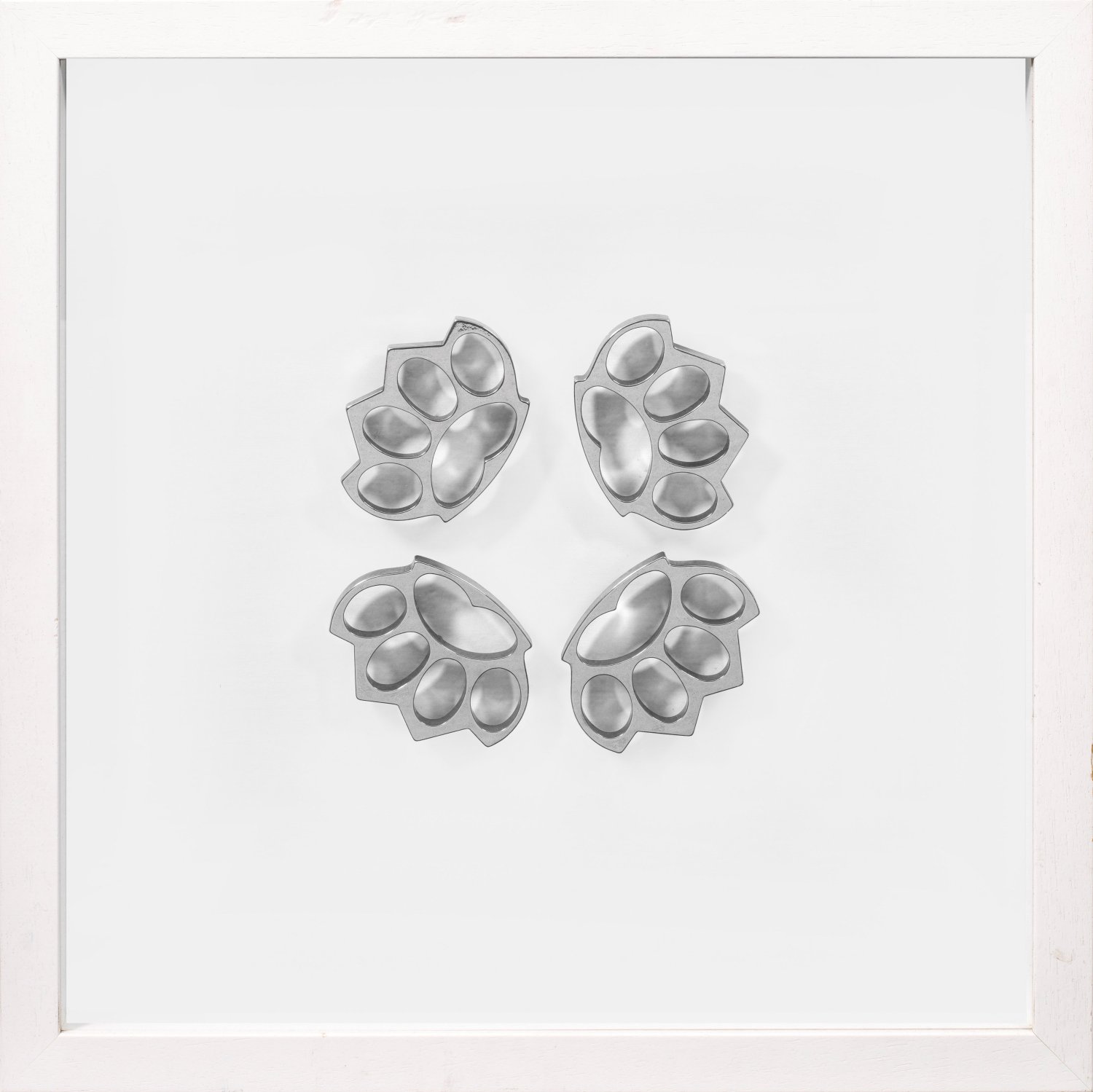 Four stainless steel brass nuckles mounted in the shape of a blossom and framed behind glass in a display frame, 2007. Signed, dated and numbered 1/8.