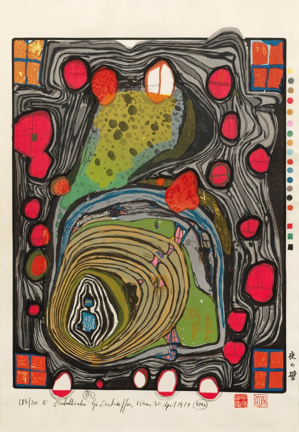 Farbholzschnitt/Japan, 1979. In schwarzer Tinte nummeriert 186/210, mit Copyrightzeichen, sign. "Dunkelbunter Hundertwasser", mit Ortsangabe Wien dat. "30 April 1979" und Werknummer 404A sowie mit zwei Inkan-Stempeln in Rot. Im Stock außerhalb der Darstellung japanisch betitelt. Gedruckt von Matashiro Uchikawa, Tokio. Herausgegeben von Gruener Janura AG, Glarus/Schweiz. Wvz. Fürst HWG 74; Koschatzky 404 A. Darstellung ca. 50 cm x 37,5 cm. 58,5 cm x 40,2 cm (Passepartoutausschnitt). Rahmen.