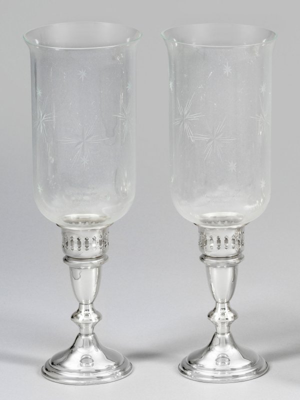 sog. Hurricanes. Sterlingsilber und farbloses Glas. Trompetenförmiger Stand, beschwert. Kurzer Balusterschaft mit vasenförmiger Tülle, als Tafelleuchter nutzbar. Darüber ein hoher, herausschraubbarer Galerierand, als Träger für einsetzbaren hohen, glockenförmigen Korpus mit Sternschliffdekor. Gest. "Sterling", Herstellerzeichen. Gew. ohne Glaseinsatz 475 g. H. 11 cm - 31 cm.