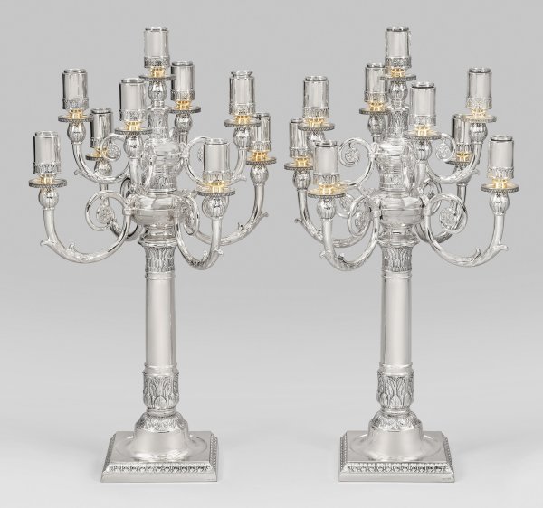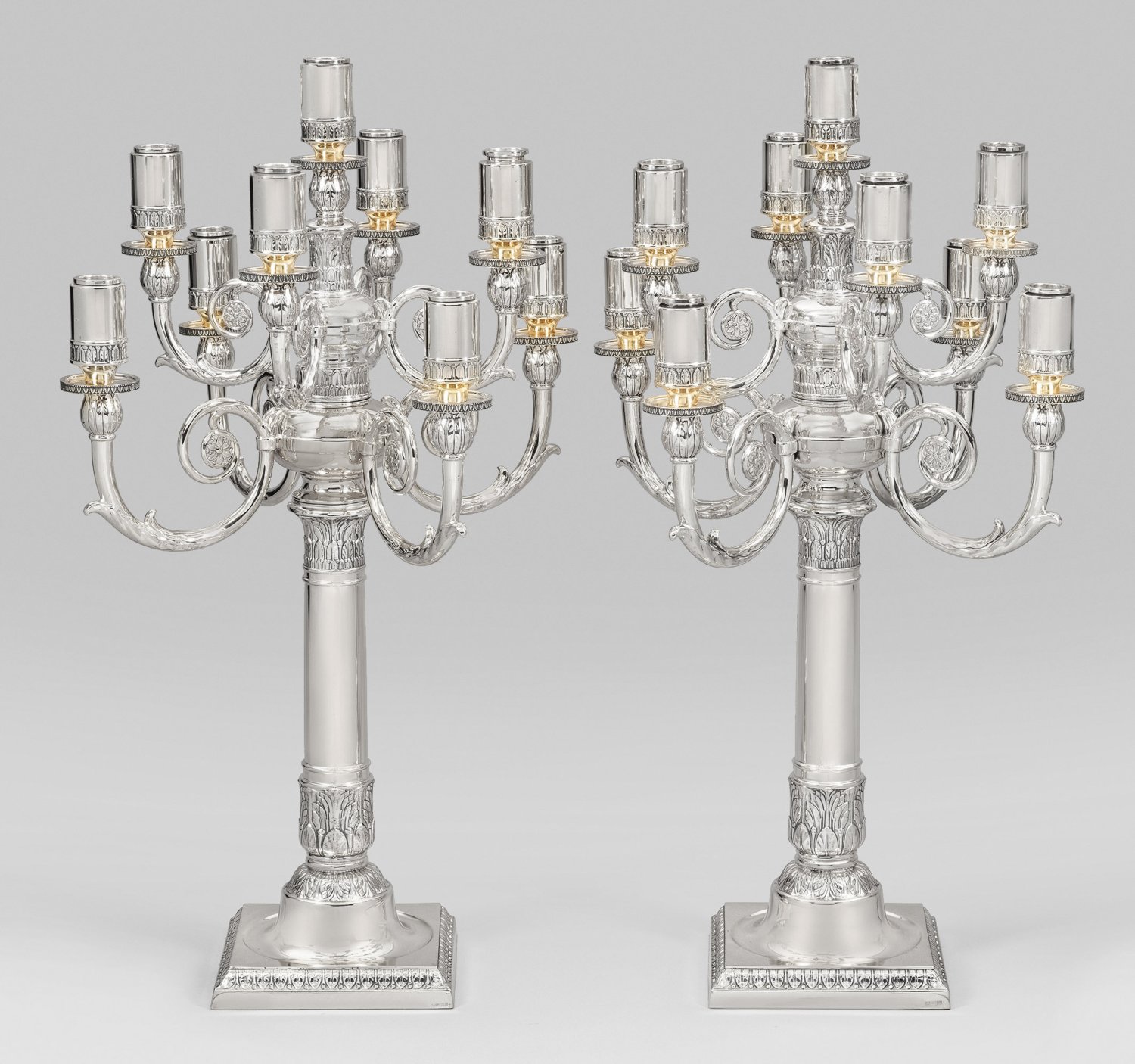 Sterlingsilber, beschwert und teilw. vergoldet. 9-flg.; Quadratischer Stand mit ansteigenden Kanten und Blattfries. Hoher Säulenschaft umzogen von Palmetten- und Akanthusblattbändern. Schraubbarer Aufsatz bestehend aus zwei unterschiedlich großen Nodi. Davon ausgehend jeweils vier volutiert eingerollte, mit Rosetten verzierte, in stilisierten Knospen und zylindrischen Tüllen mit flachen Traufschalen endende Leuchterarme sowie ein zentraler Schaftfortsatz. Gest. 925, Herstellerzeichen. Gew. zus. ca. 11490 g. H. 73,5 cm.