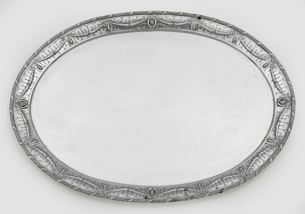 Silber. Ovale Form. Glatter Spiegel, übergehend in ansteigende, breite Fahne. Wulstartig profilierter Rand mit Rillendekor. Die Fahne verziert mit vier hochovalen Medaillons mit dem Familiensignet sowie dem Wahlspruch "Deus Providebit" der Hamburger Familie Michahelles, verbunden durch reliefplastische Lorbeerblattfestons. Gest., Pseudomarken. Gew. ca. 2600 g. 65,5 cm x 47 cm.