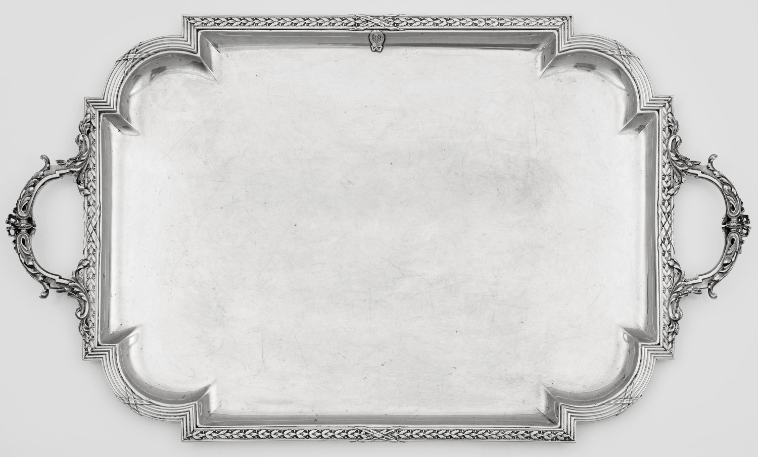 Silber. Rechteckige, flache Form mit gering gemuldetem, glattem Spiegel und gerundeten Ecken. Der Rand umzogen von Rillendekor und Lorbeerblattfries. Seitliche Handhaben in Form von gegenständlichen Akanthusblättern mit Schleifen. Auf der Fahne das applizierte, hochovale Medaillon mit dem Familiensignet sowie dem Wahlspruch "Deus Providebit" der Hamburger Familie Michahelles. Gest. 800, undeutl. Herstellerzeichen. Gew. ca. 2000 g. 92 cm x 38 cm.