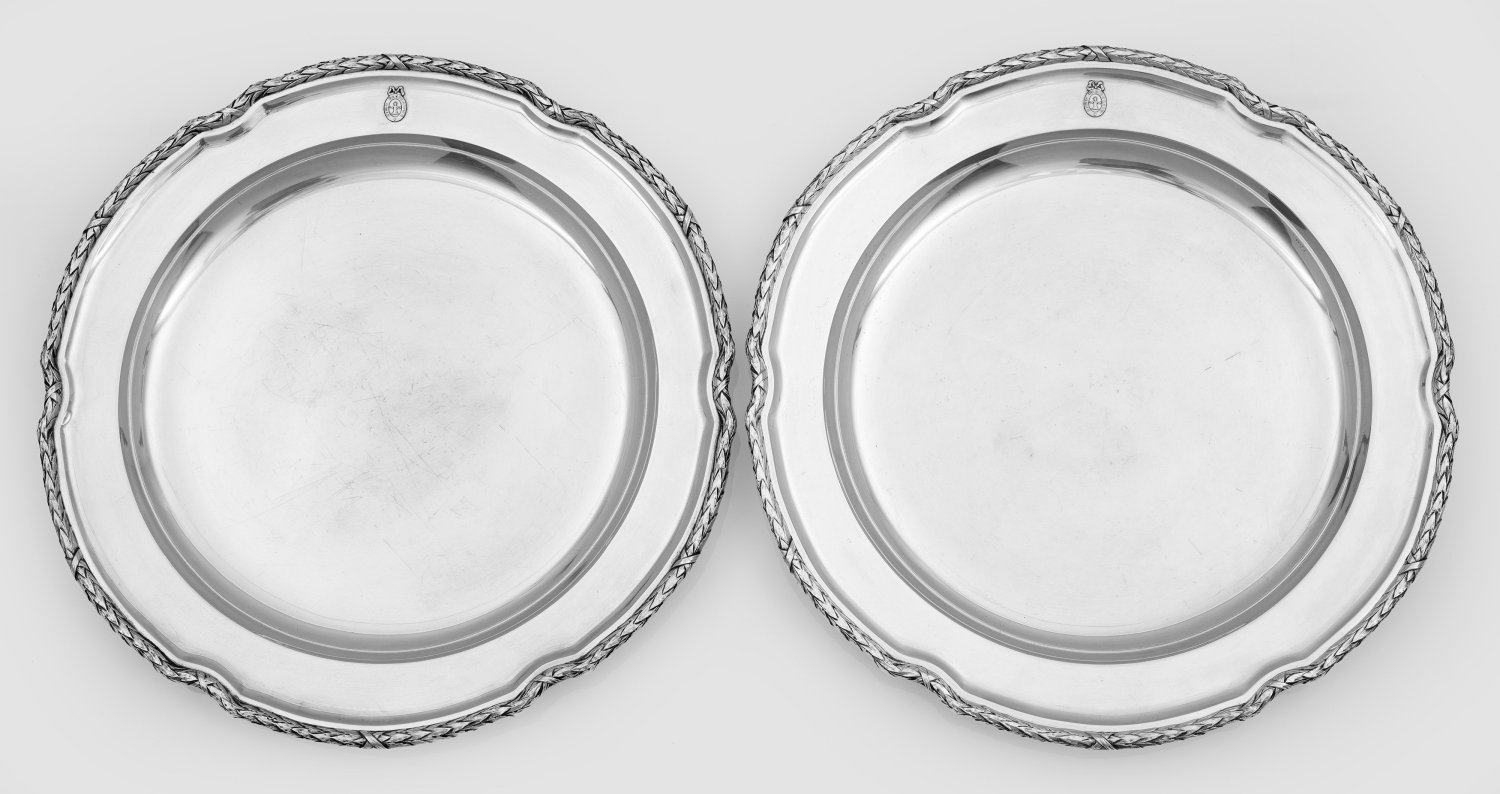 Silber. Gering vertiefter, glatter Spiegel, übergehend in breite, leicht ansteigende Fahne. Blütenförmig geschweifter Rand, umzogen von reliefplastischem Lorbeerblattfries und Kreuzbanddekor. Auf der Fahne das applizierte, hochovale Medaillon mit dem Familiensignet sowie dem Wahlspruch "Deus Providebit" der Hamburger Familie Michahelles. Gest. 800, Herstellerzeichen, Modell-Nr. 294841. Gew. zus. ca. 2680 g. D. 38,5 cm.