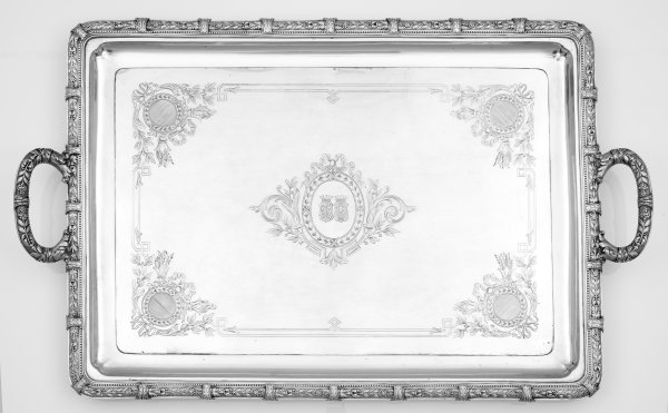 Silber. Rechteckige, flache Form mit gerundeten Ecken. Glatter Spiegel mit gering gemuldeter, ansteigender Fahne. Der Rand umzogen von reliefplastischem Früchte- und Blattdekor sowie mit feinem Perlband akzentuiert. Der Spiegel verziert mit gravierten Lorbeerkränzen, Triumphbündeln, Voluten und Schleifen. Zentral ein graviertes Allianzwappen u. a. der österreichisch-ungarischen Adelsfamilie Mocioni oder auch Mocsonyi de Foen. Das zweite Wappen unter Fürstenkrone. Seitliche, aus Akanthusblättern erwachsende, gebogte Handhaben. Auf der Unterseite als Verstärkung ein befestigter Holzrahmen. Gest., Beschauzeichen seit 1872, undeutliches Herstellerzeichen "A ? ?". Gew. ca. 4260 g. 74 cm x 45,5 cm.