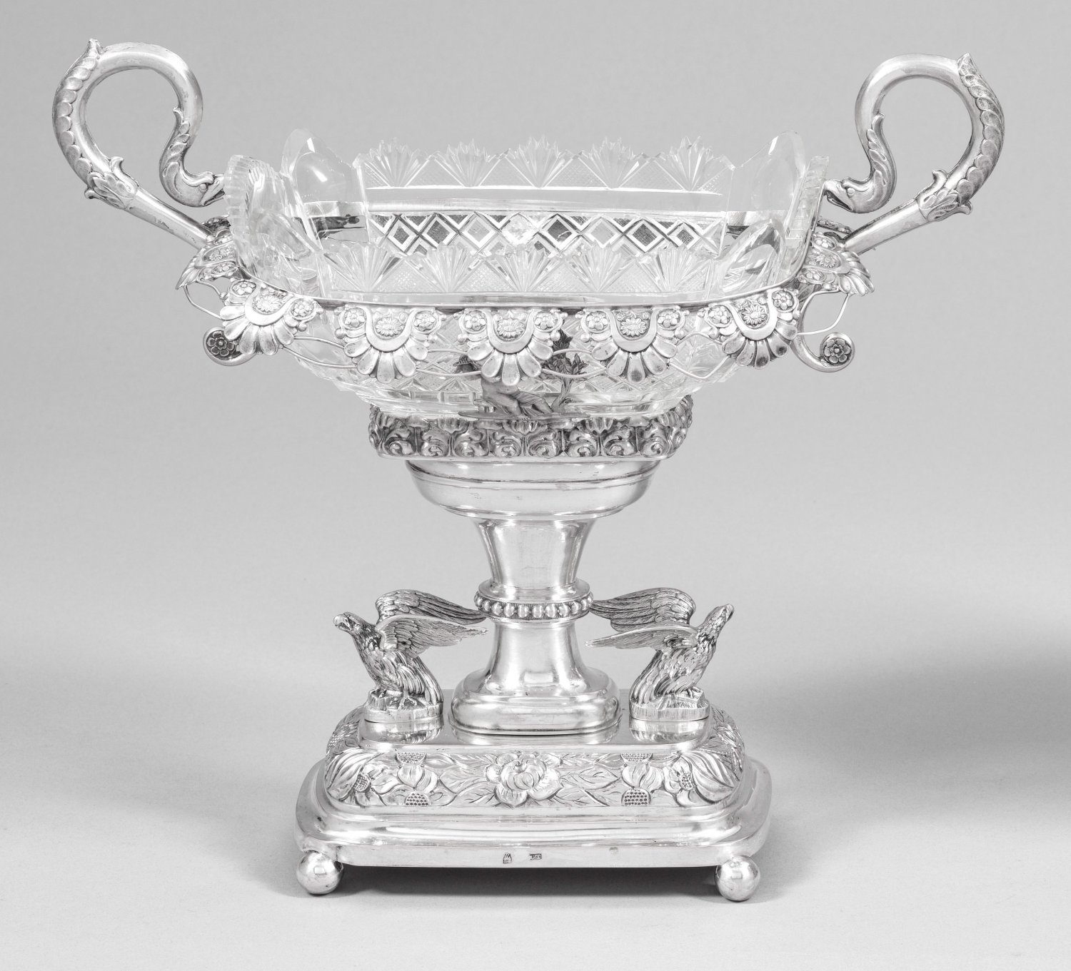 Silber und farbloses Kristallglas. Rechteckig aufgewölbter Stand mit gerundeten Ecken über vier Kugelfüßen. Zentraler, konischer Schaft, flankiert von zwei vollplastischen Adlerfiguren. Durchbrochen gearbeitete Kuppawandung schau- und rücks. mit musizierender Puttodarstellung, Palmettenband und seitlich aufsteigende Ohrenhenkel in Adlerköpfen endend. Gitterähnlich facettiert geschnittener Glaseinsatz. Gest., Beschauzeichen, Meister Johann Gottlob Christian Tormählen (wird Meister 1818). Gew. ohne Einsatz 330 g. H. 24,5 cm. 27 cm x 13 cm.
