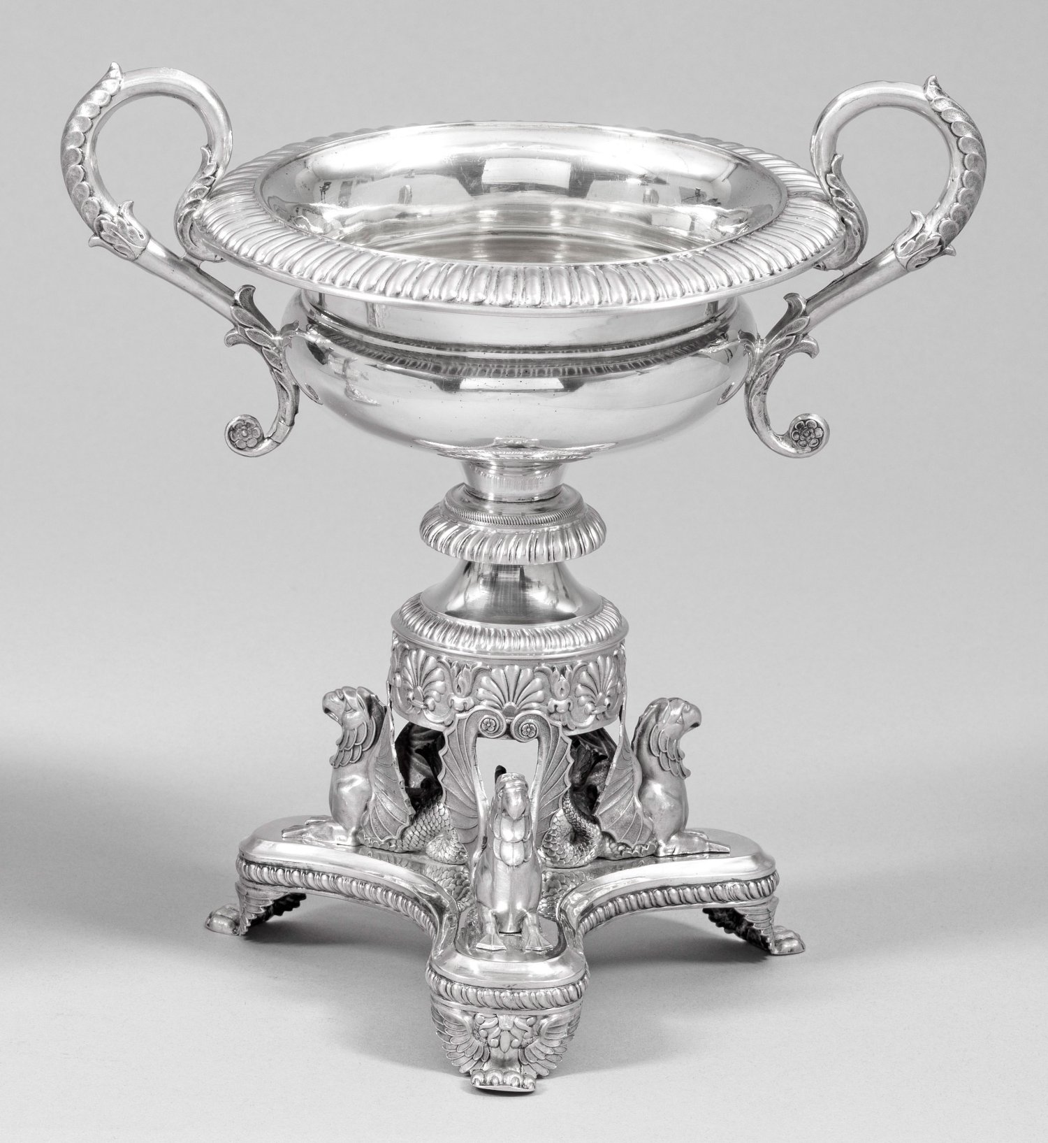 Silber. Über drei Tatzenfüßen, dreipassiger Stand mit drei vollplastischen Greifen, einen kurzen Balusterschaft, umzogen von Palmettenband tragend. Gedrückt bauchige Kuppa mit breitem, godroniertem Rand. S-förmigen Henkeln. Innen vergoldet. Gest., Beschauzeichen, unbekanntes Meisterzeichen "Schrof". Gew. ca. 370 g. H. 23,7 cm.