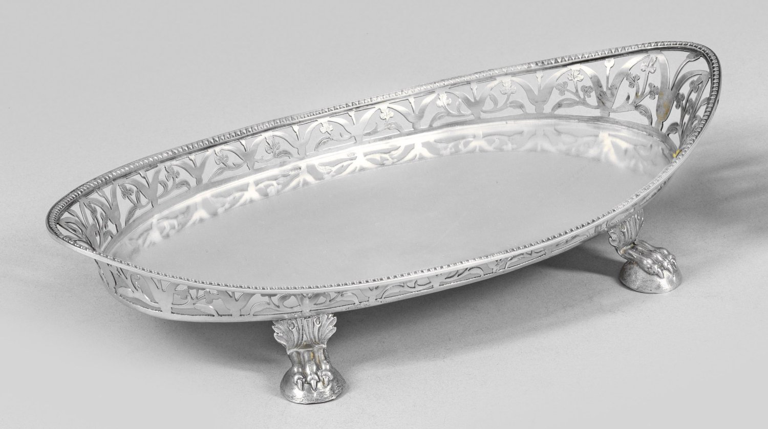 Silber. Über vier Tatzenfüßen, länglich ovale Platte mit glattem Spiegel, übergehend in filigran durchbrochen gearbeiteten Galerierand aus stilisierten Ranken und Blättern. Füße rest.; Gest., Beschauzeichen, Meister Johann Jakob IV Bruglocher (wird Meister um 1811) oder seine Witwe, die von 1845 bis 1853 seine Werkstatt fortführt. Gew. ca. 240 g. H. 4,7 cm. 23,5 cm x 12 cm.