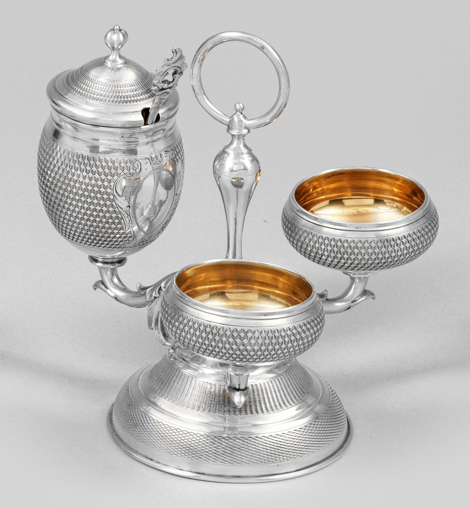 Silber Aufgewölbter, runder Stand. Davon ausgehend drei volutierte Arme in zwei kleinen Schälchen für Gewürze sowie einem ovoiden Senftöpfchen mit scharniertem Deckel endend. Die Wandungen mit feinem Guilloche-Dekor sowie teilw. mit einer freien Kartusche verziert. Zentral aufsteigender, konischer Schaft mit Ringgriff. Dazu ein Löffel. Innen vergoldet. Gest. 13 Lot. Gew. ca. 220 g. H. 15,3 cm.