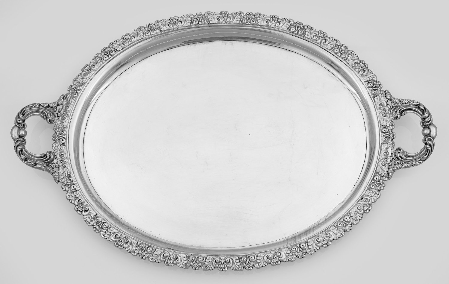 Silber. Ovale Form. Glatter Spiegel, übergehend in stark ansteigende, randprofilierte Fahne mit reliefplastisch gestalteten Rand aus Akanthusblättern. Korrespondierend verzierte, seitliche Handhaben. Gest., Beschauzeichen, Meister Johann Friedrich Brahmfeld (wird Meister 1814). Gew. ca. 1675 g. 59,5 cm x 38 cm.