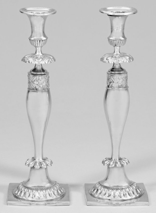 A pair of Wroclaw Biedermeier silver candlesticks by Johann David Klose (master since 1816). Partly damaged and restored. Assay and master´s mark. Date letter "R".