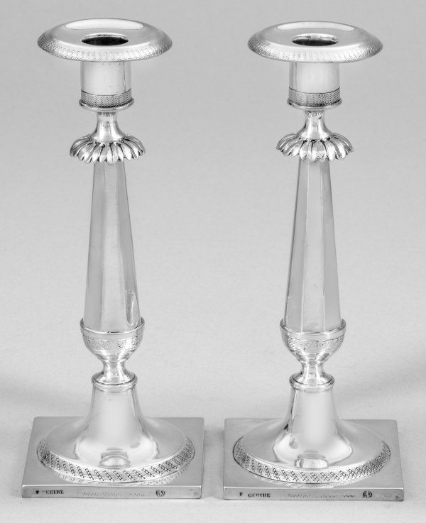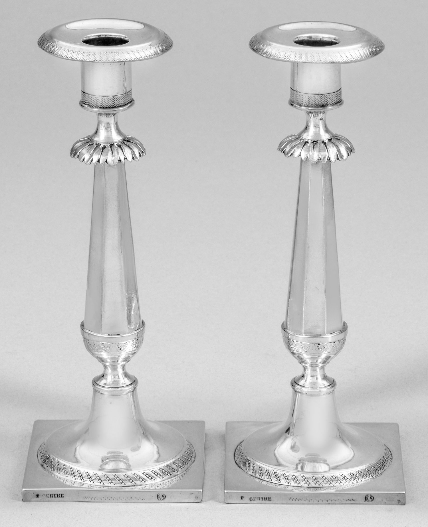 A pair of Biedermeier silver candlesticks by Johann Ludwig Gericke/Gerike (master since 1815). Test, assay and master´s mark. Further mark "F".