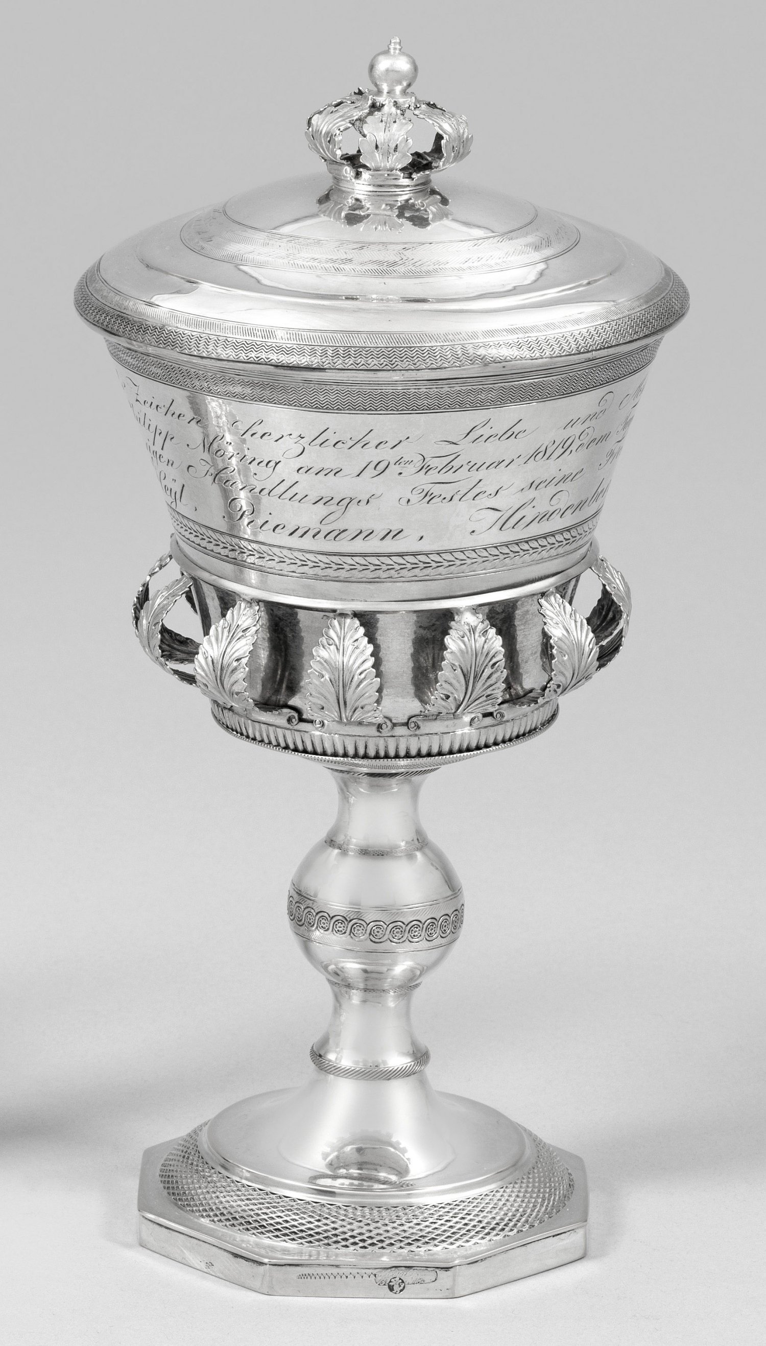 Silber. Achtfach gekanteter Stand, übergehend in kurzen Balusterschaft und konisch aufsteigende, glatte Kuppa mit Widmung "Diesen Becher überreichten, als Zeichen herzlicher Liebe und Achtung ihrem Kollegen, Herrn Carl Philipp Möring am 19ten Februar 1819, [...] seine Freunde Köhler, Jung, Grasnick, Heyl, Riemann, Hindenberg". Untere Wandungshälfte mit durchbrochen gearbeitetem Reif aus nach außen gebogten Akanthusblättern verziert. Steckdeckel mit kronenähnlichem Blätterkranz und Kugelknauf. Innen vergoldet. Gest., Tremolierstrich, Beschauzeichen, undeutliches Meisterzeichen. Gew. ca. 540 g. H. 26 cm.