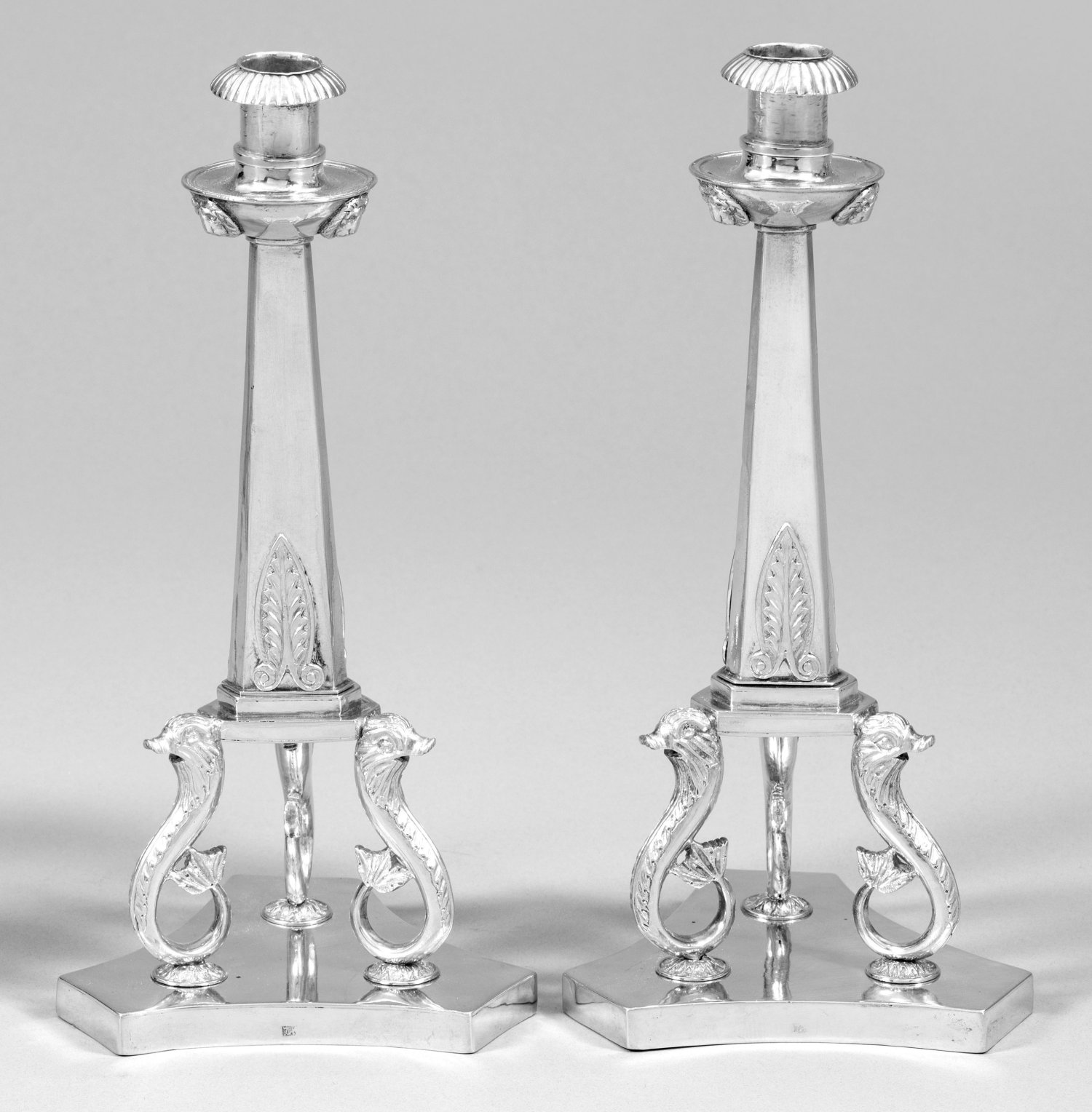 Silber. Dreipassig geschweifte, glatte Plinthe. Darüber drei vollplastisch gearbeitete, aufgerichtete Delphine als Träger für den länglich pyramidenähnlichen, fünffach gekanteten Schaft, umzogen von Lanzettblättern. Halbkugelige Traufschale mit reliefplastischen Löwenköpfen und zylindrische Tülle mit Godronen verziert. Gest. 12 Lot. Gew. zus. ca. 855 g. H. 25,5 cm.