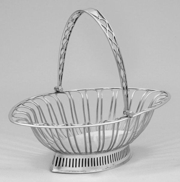 Silber. Elliptischer, profilierter Stand umlaufend durchbrochen gearbeitet in Form von Stabfries mit glattem Spiegel. Aus schmalen, zungenförmig gebogten und äußerst fein kannelierten Streben bestehende Wandung mit ausgestelltem Rand. Übergreifender, scharnierter Henkel ebenfalls aus filigranen, wellenförmigen Streben geformt. Gest. 12 Lot, Meister Dirk Byl (wird Meister 1806). Gew. ca. 815 g. H. 27 cm. 32 cm x 21,5 cm.