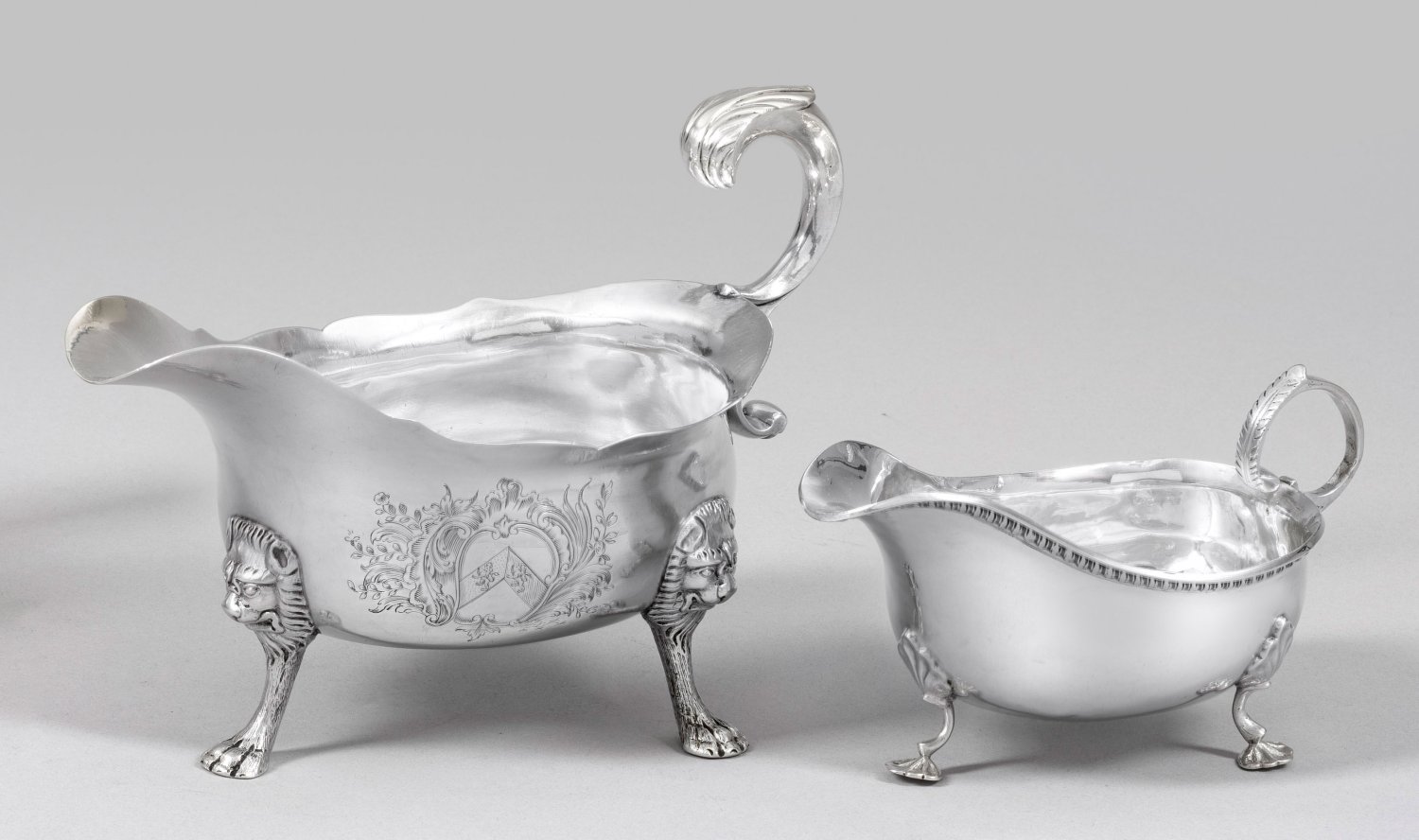 Sterlingsilber. Von drei am Ansatz u. a. mit Löwenköpfen verzierten Füßen getragener, schiffchenförmiger Korpus mit Volutenhenkel. Teilw. graviertes Wappen und sog. Crest. Gest., Beschaumarken, teilw. undeutl. Herstellerzeichen und Jahresbuchstaben. Gew. zus. ca. 535 g. H. 8 cm - 13 cm.