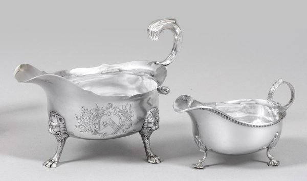 An English and an Irish Sterling silver sauce boat partly with engraved coat or arms and crest. Assay- and partly indistinct master´s mark, date letter.