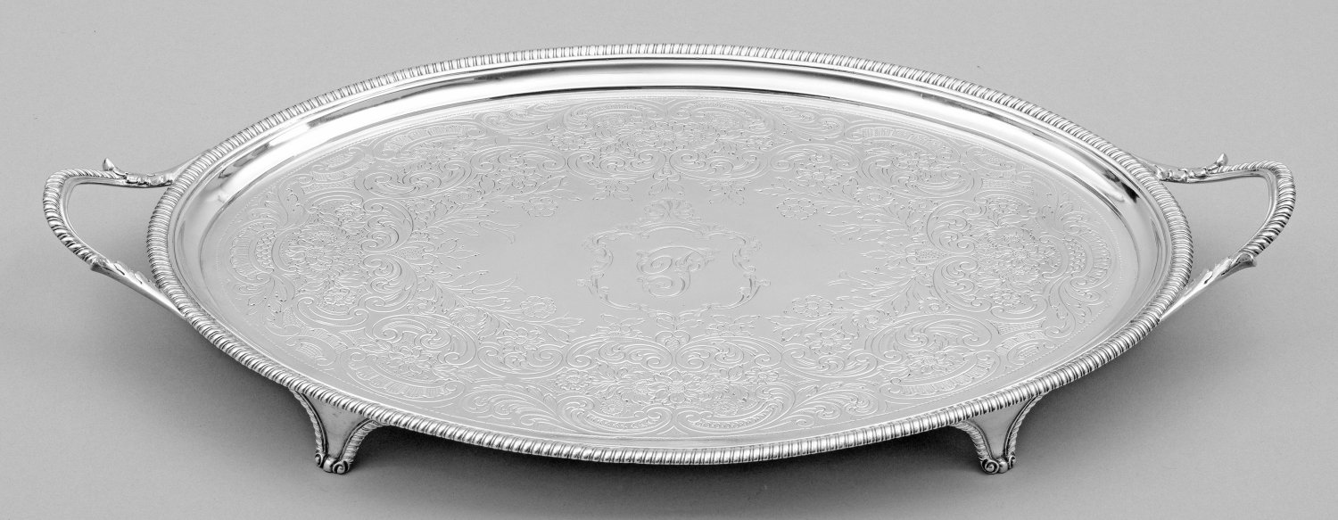 Sterlingsilber. Ovale Form auf vier konischen, volutierten Füßen. Gering gemuldeter Spiegel, übergehend in gekehlt ansteigende Fahne, umzogen von godroniertem Zierband. Seitlich zwei aus Akanthusblättern erwachsende, korrespondierend godronierte Handhaben. Im glatten Spiegel eine volutierte Kartusche mit graviertem "P", umzogen von üppigem Blattranken-, Blüten-, Voluten- und Rocaillendekor. Gest., Beschaumarken, Herstellerzeichen, Jahresbuchstabe "I". Gew. ca. 2450 g. H. 6,5 cm. 61,5 cm x 38 cm.