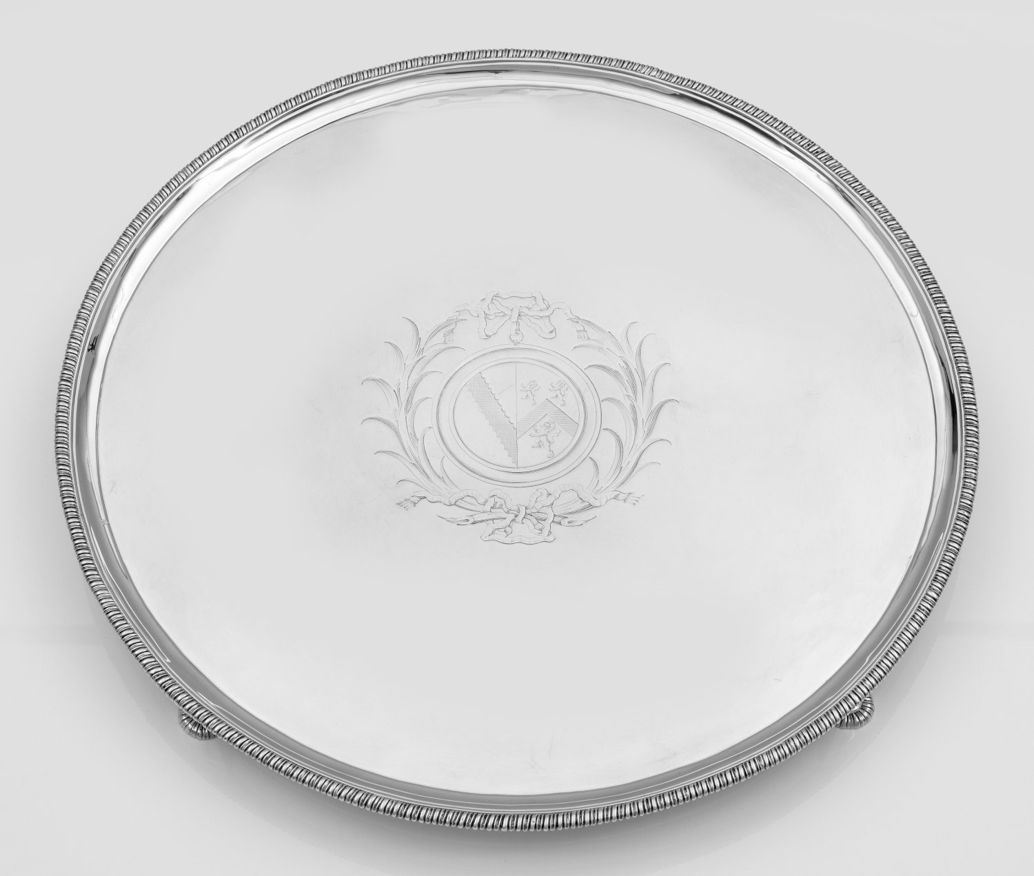 Sterlingsilber. Über vier halbrunden, godronierten Füßen, runde Platte mit glattem, geradem Spiegel und gering gekehlt ansteigender Fahne in korrespondierend godroniertem Rand endend. Zentral im Spiegel ein rundes, graviertes Wappen, mit drei steigenden Löwen, Sparren und schrägrechtem Dornenbalken. Als Umrandung ein mit Schleifen gebundener Blattkranz. Gest., Beschaumarken, Meister Ebenezer Coker (tätig ab ca. 1739), Jahresbuchstabe "R". Gew. ca. 2950 g. H. 3,8 cm. D. 49 cm.