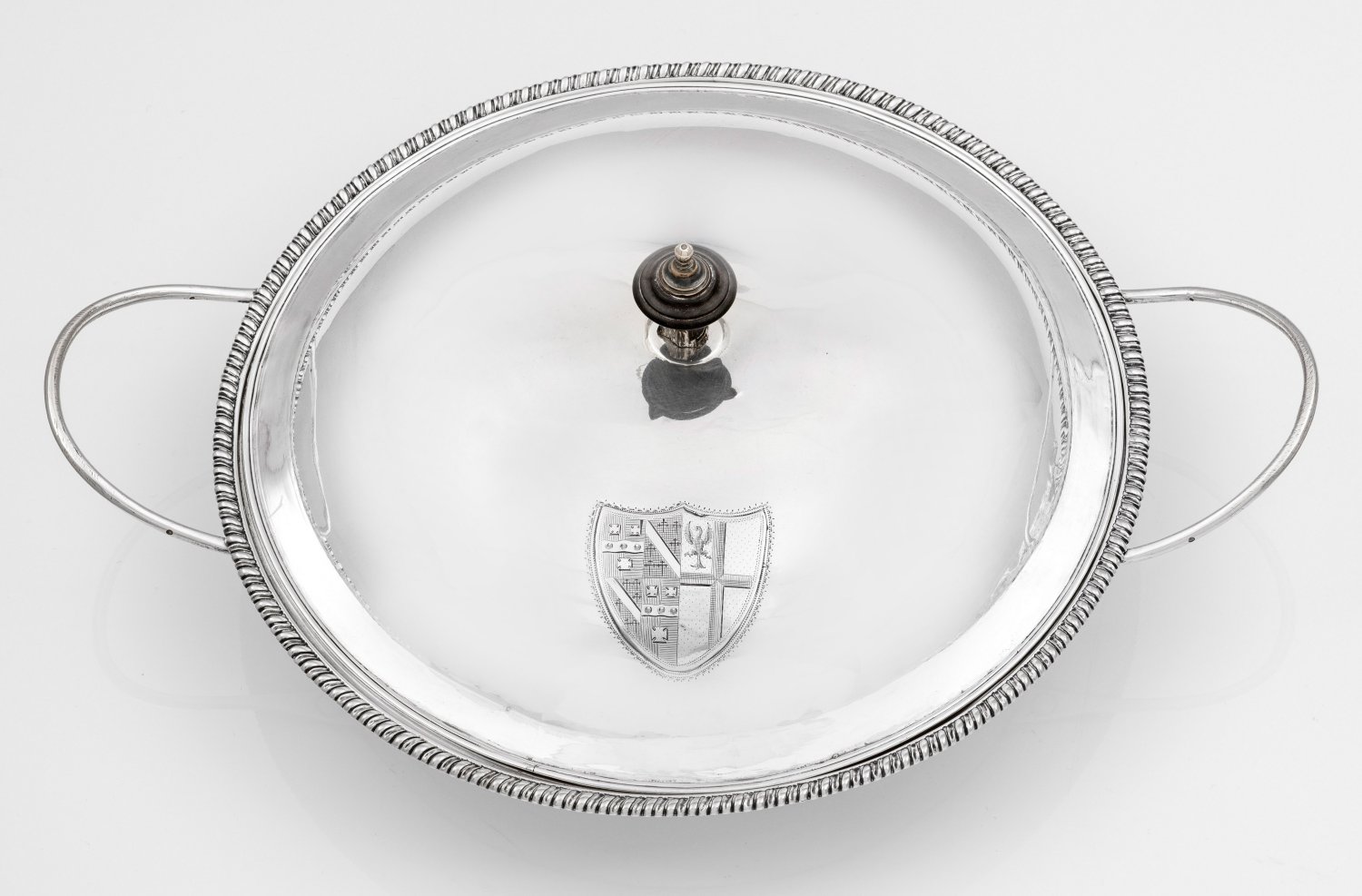 Sterlingsilber. Gemuldete Schale mit ausgestellter Fahne, umzogen von Godronenband. Seitliche, genietete Handhaben. Aufgewölbter Deckel mit Balusterknauf. Fahne mit graviertem sog. Crest sowie der Deckel mit Wappen. Gest., Beschaumarken, Meister wohl Louis Guichard (tätig seit 1748), Jahresbuchstabe "E". Gew. ca. 635 g. H. 11 cm. D. 24 cm.