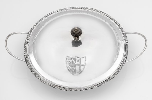 An English Sterling silver lidded tureen probably by Louis Guichard (active since 1748) with engraved coat of arms and crest. Assay and maker´s mark, date letter "E".