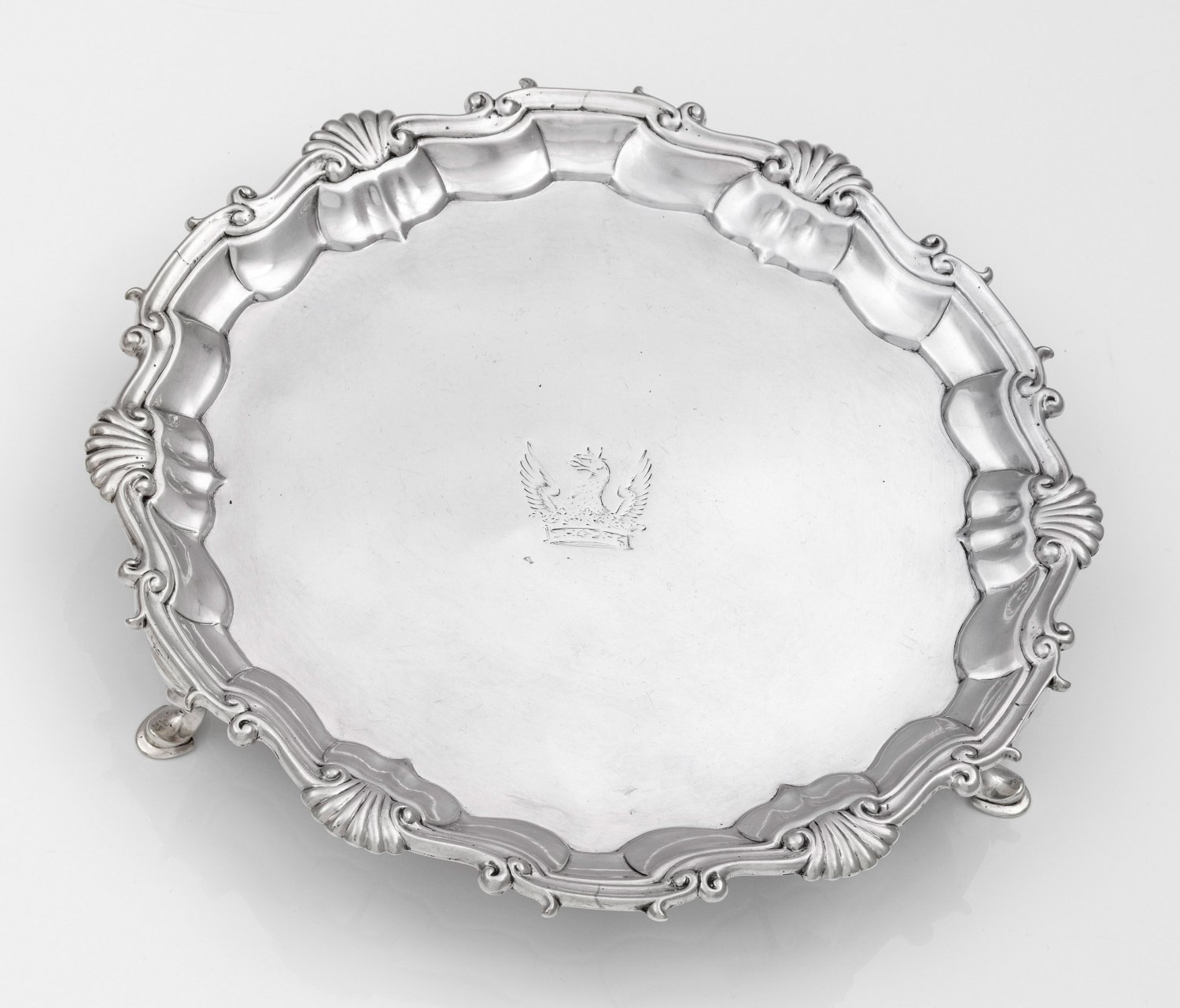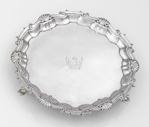 Sterlingsilber. Von drei ausgestellten Füßen getragene, runde Platte. Passig geschweifter Rand, umzogen von reliefplastischem Zierband aus Voluten und Muschelwerk. Im Spiegel graviert ein sog. Crest in Form eines Greifs über einer Krone. Gest., Beschaumarken, Meister Hugh Mills (tätig seit ca 1746), Jahresbuchstabe "O". Gew. ca. 355 g. D. 21 cm.