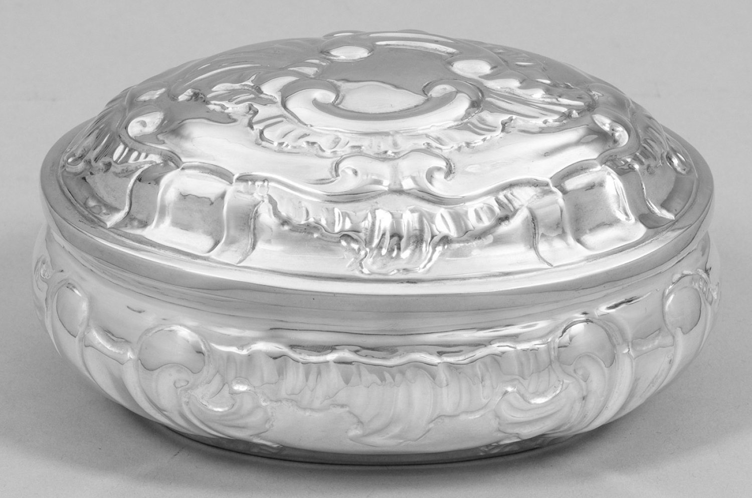 Silber. Gedrückt bauchiger, ovaler Korpus mit Steckdeckel. Wandung und Deckel flächendeckend verziert mit stark reliefplastischem Rocaillendekor, C-Schwüngen und wellenartigen Zügen. Innen vergoldet. Gest., Tremolierstrich, Beschauzeichen, Meister Georg Nicolaus I Bierfreund (wird Meister 1740). Gew. ca. 170 g. H. 7 cm. 14,5 cm x 10 cm.
