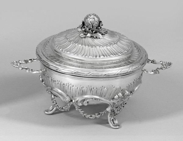 Silber. Über drei eingezogenen Füßen, verbunden durch durchbrochen gearbeitete Blattfestons, eine tief gemuldete Schale mit profiliertem, aufgewölbtem Steckdeckel. Als Knauf ein stilisierter Kohlkopf. Korpus und Deckel reliefplastisch umzogen von Rocaillen, Voluten und Kanneluren. Seitlich zwei volutierte Handhaben. Gest., Beschaumarken, Pächter Eloi Brichard tätig 1756-1762, Meister Joseph-Catherine Varlet (tätig ab ca. 1745). Gew. ca. 790 g. H. 16,5 cm.