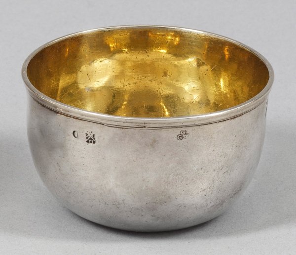 Silber. Über eingezogener Standfläche sich konisch erweiternder Korpus. Glatte Wandung, übergehend in durch schmale Profillinien akzentuierten, gering ausgestellten Lippenrand. Gest., Beschauzeichen, bisher unbekannter Meister "GGW", Jahresbuchstabe "D". Gew. ca. 65 g. H. 4 cm. D. 6,3 cm.