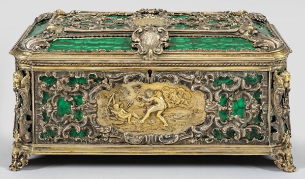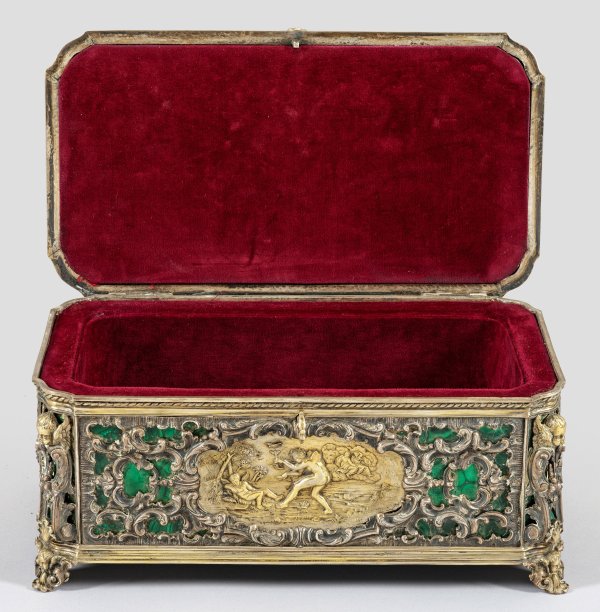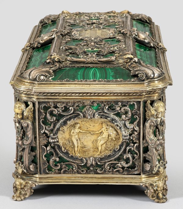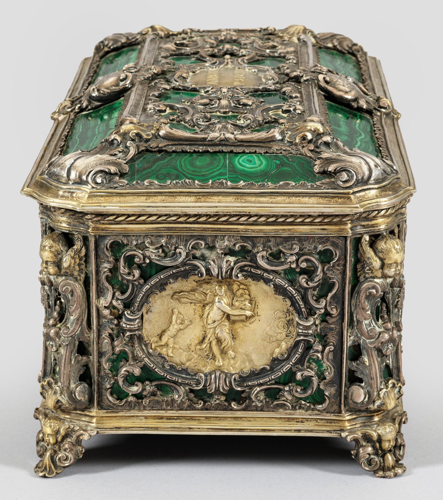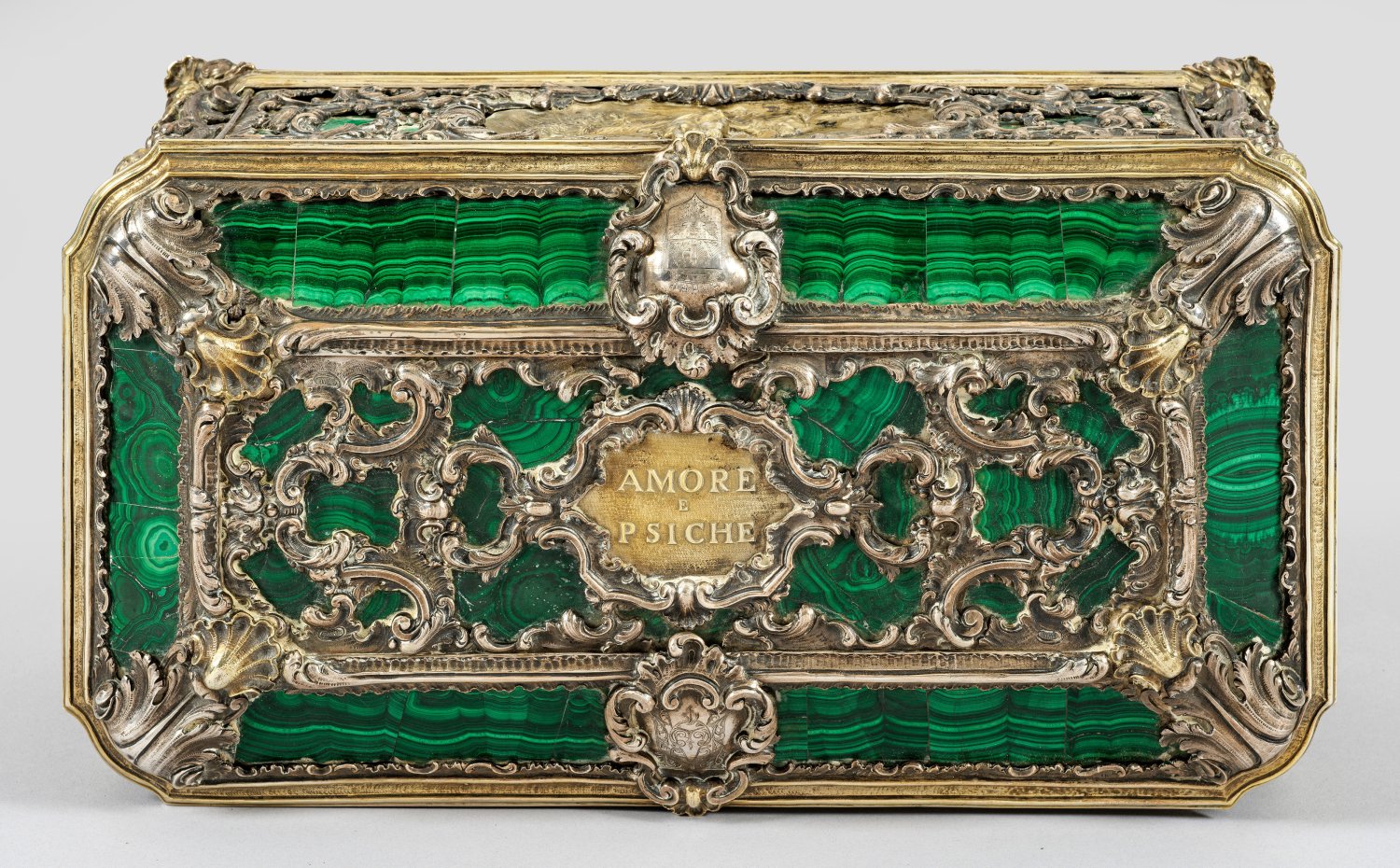 Silber, teilw. vergoldet, und Malachit. Über vier gering ausgestellten Füßen in Form von Muschelwerk ein länglich rechteckiger Korpus mit abgeschrägten, passig geschweiften Ecken, durch feine Engelköpfe dekoriert. Die gerade Wandung und der aufgewölbte Scharnierdeckel üppig durchbrochen verziert mit hochreliefplastischem Akanthusblatt-, Muschelwerk- und Rocaillendekor sowie mit äußerst fein gemasertem, geschnittenem Malachit hinterlegt. In der Wandung umlaufend vier Kartuschen mit eingesetzten, konkaven und vergoldeten Plaketten. Darauf detailliert dargestellte, reliefplastische Szenen des Mythos von Amor und Psyche. Auf den ansteigenden Deckelkanten zwei aufgelegte, von C-Schwüngen gerahmte Kartuschen mit gravierten Akanthusblättern bzw. mit graviertem Wappen der italienischen Stadt Forli in der Region Emilia-Romagna. Zentrale, vergoldete Plakette mit Schriftzug "AMORE E PSICHE". Schauseitiges Schlüsselloch mit Schlüssel in Form von zwei Turteltauben. Gew. ca. 7400 g. H. 19 cm. 39 cm x 21 cm.