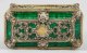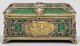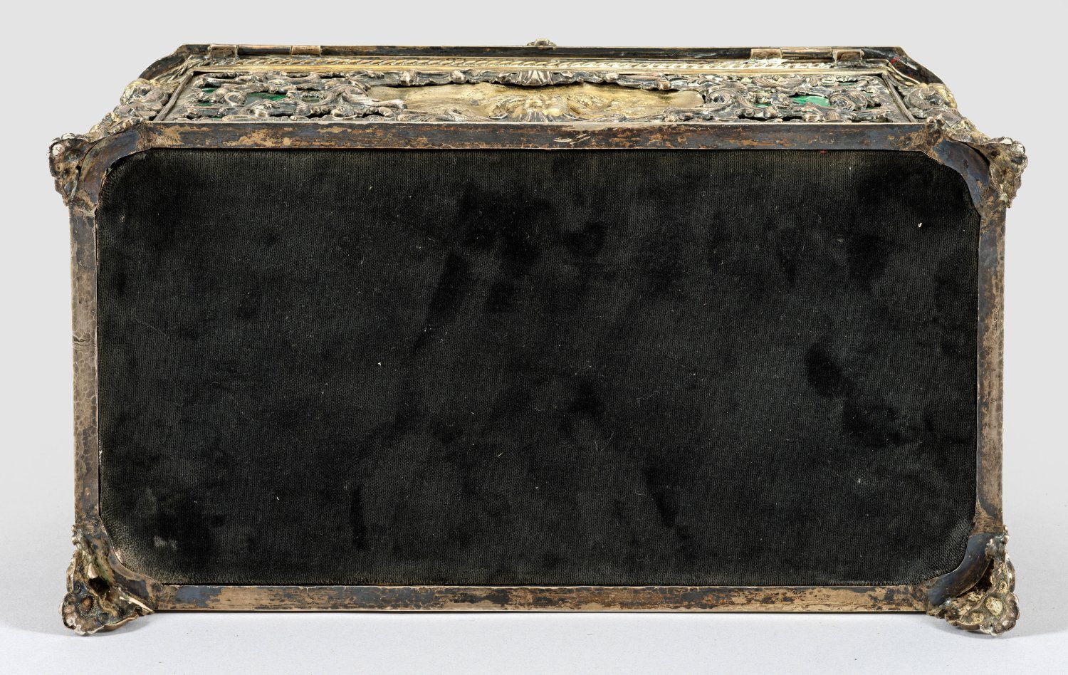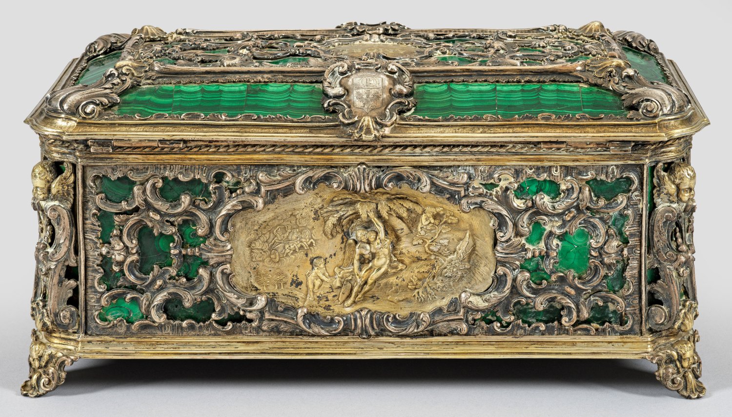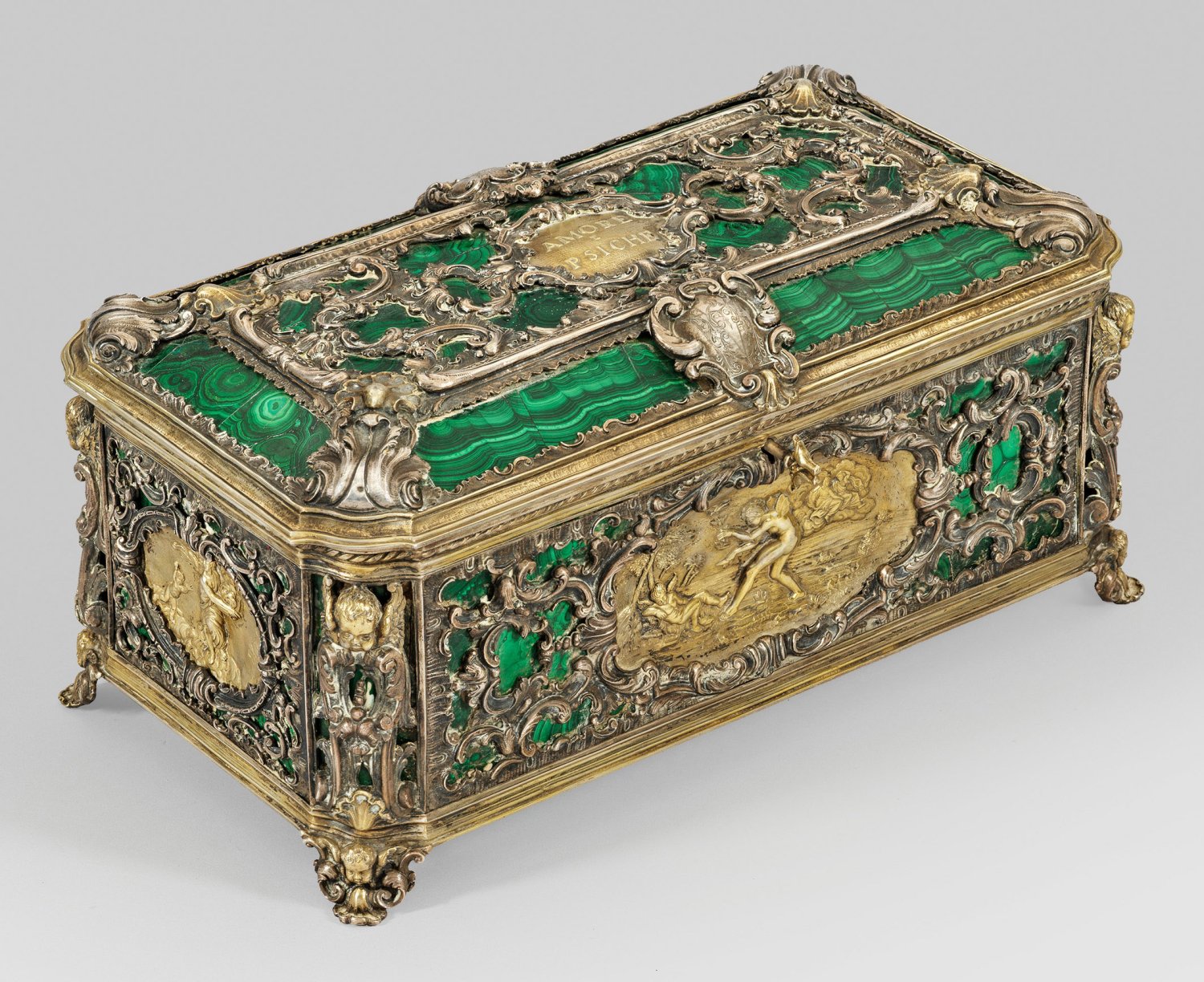 Silber, teilw. vergoldet, und Malachit. Über vier gering ausgestellten Füßen in Form von Muschelwerk ein länglich rechteckiger Korpus mit abgeschrägten, passig geschweiften Ecken, durch feine Engelköpfe dekoriert. Die gerade Wandung und der aufgewölbte Scharnierdeckel üppig durchbrochen verziert mit hochreliefplastischem Akanthusblatt-, Muschelwerk- und Rocaillendekor sowie mit äußerst fein gemasertem, geschnittenem Malachit hinterlegt. In der Wandung umlaufend vier Kartuschen mit eingesetzten, konkaven und vergoldeten Plaketten. Darauf detailliert dargestellte, reliefplastische Szenen des Mythos von Amor und Psyche. Auf den ansteigenden Deckelkanten zwei aufgelegte, von C-Schwüngen gerahmte Kartuschen mit gravierten Akanthusblättern bzw. mit graviertem Wappen der italienischen Stadt Forli in der Region Emilia-Romagna. Zentrale, vergoldete Plakette mit Schriftzug "AMORE E PSICHE". Schauseitiges Schlüsselloch mit Schlüssel in Form von zwei Turteltauben. Gew. ca. 7400 g. H. 19 cm. 39 cm x 21 cm.