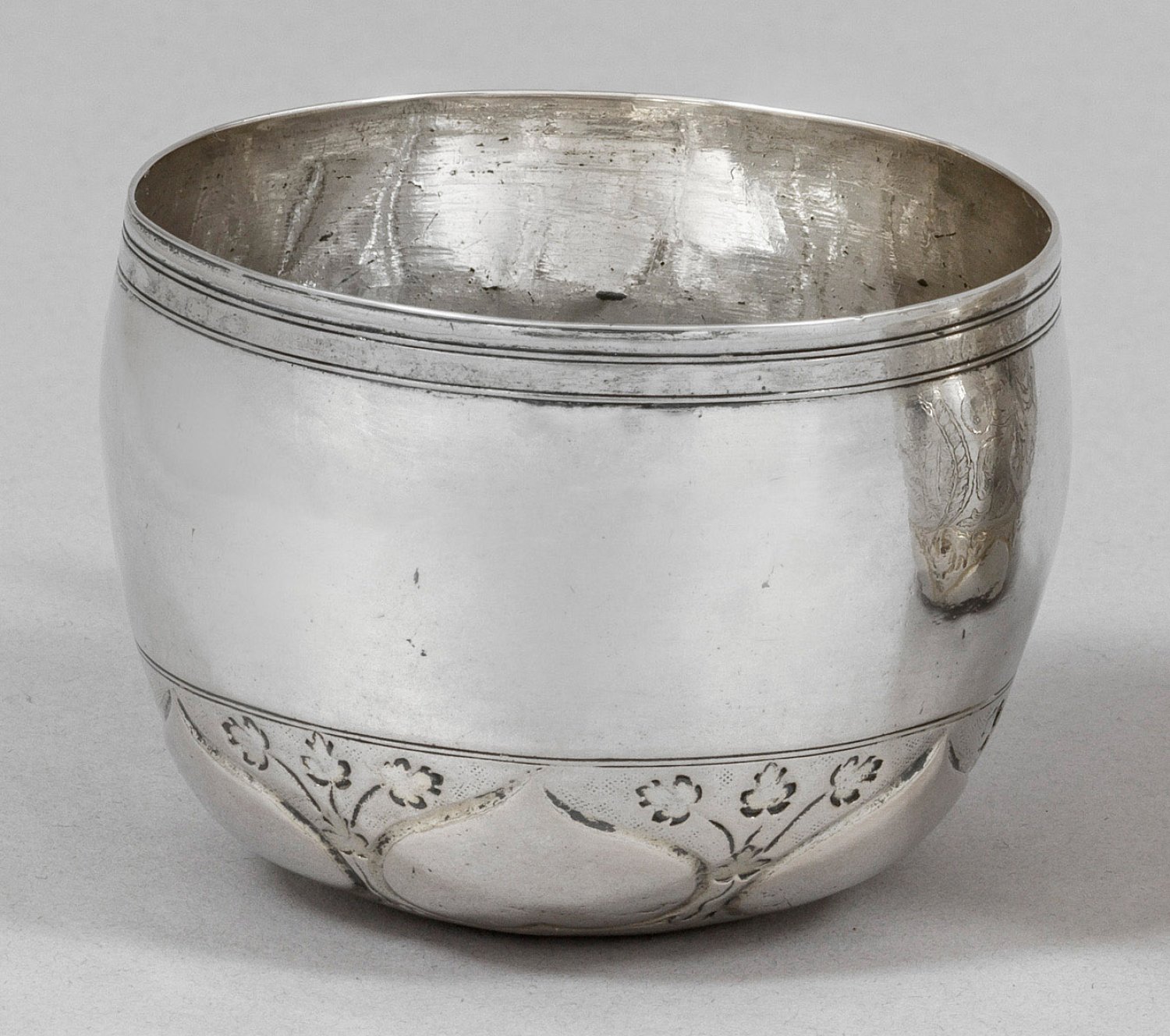 Silber. Über flacher, gering eingezogener Standfläche gebauchter Korpus. Die untere Wandungshälfte verziert mit reliefplastisch getriebenen Herzbuckeln. Bodenunterseite graviert "2023". Gest., Tremolierstrich, Beschauzeichen, Meister Ferdinand Schönfeld (wird Meister um 1686). Gew. ca. 55 g. H. 5 cm. D. 6,5 cm.