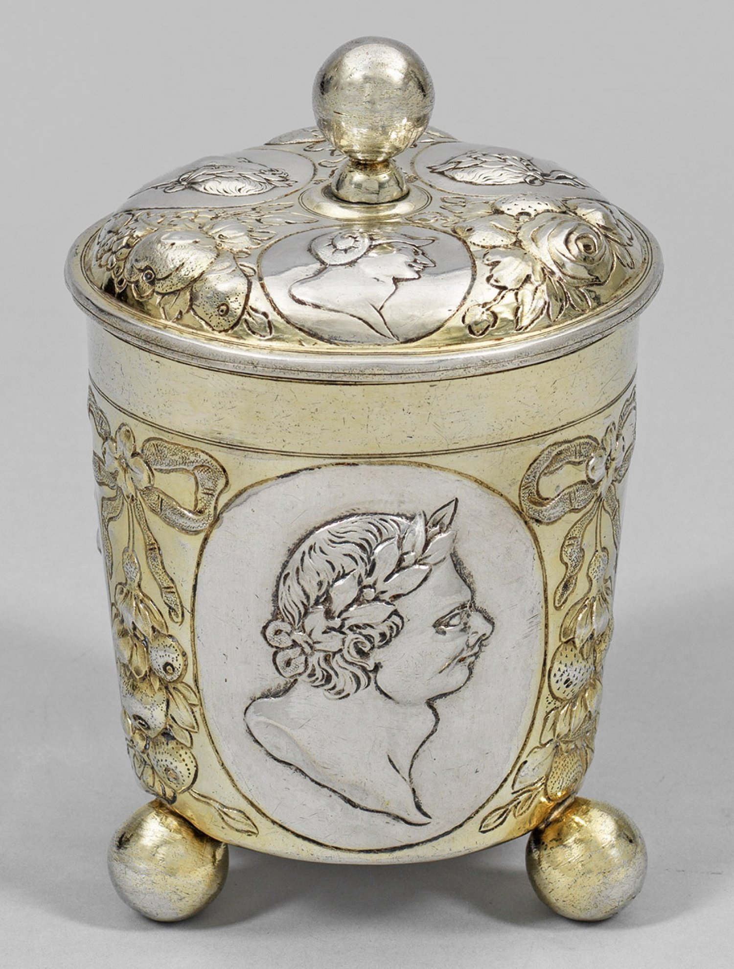 Silber, teilw. vergoldet. Von drei ausgestellten Kugelfüßen getragener, nahezu zylindrischer Korpus. Breite, von zarten Profillinien abgesetzte, glatte Randzone mit gering ausgestelltem Lippenrand. Wandung unterteilt durch drei hochovale Medaillons mit detailliert ausgearbeiteten Imperatorenbüsten im Profil alternierend mit naturalistischen, reliefplastischen Schleifen über Fruchtbündeln in feiner Treib- und Gravurarbeit. Gewölbter Stülpdeckel mit korrespondierendem Dekor und zentralem Kugelknauf. Innen vergoldet. Gest., Tremolierstrich, Beschauzeichen, Meister Simon Wickert (wird Meister um 1691). Gew. ca. 510 g. H. 18 cm.