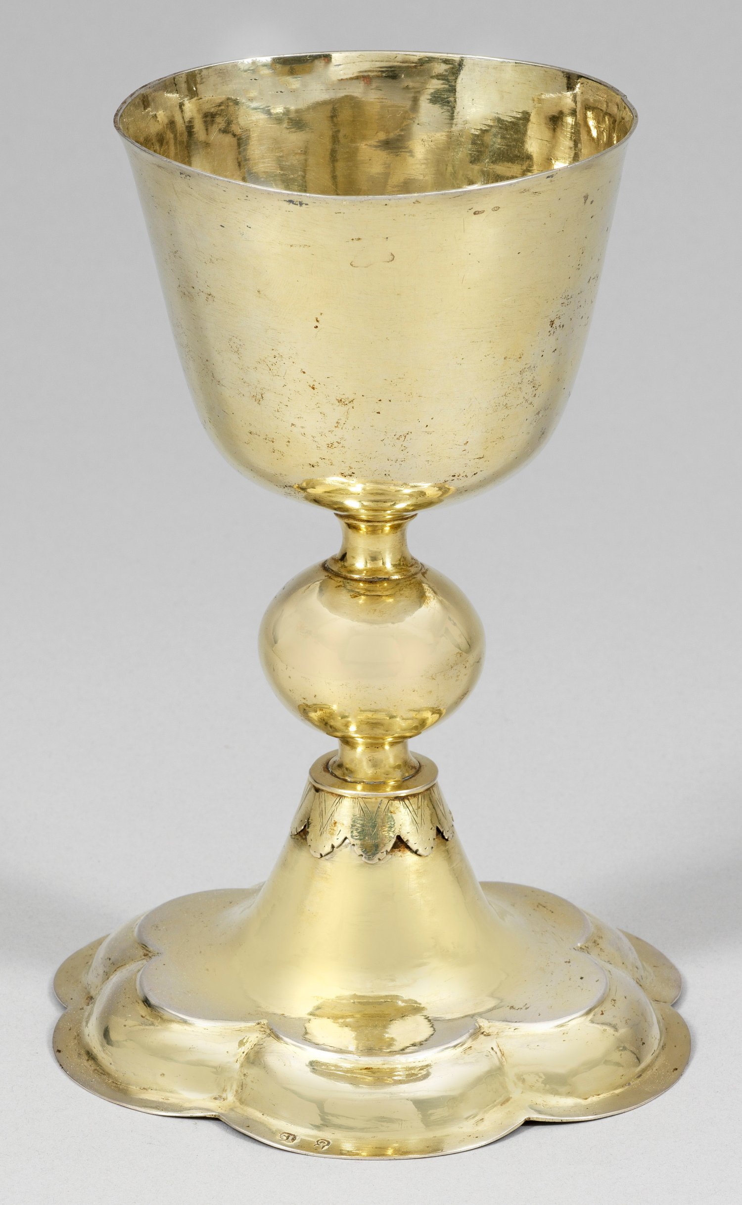 Silber, voll vergoldet. Blütenförmig geschweifter und gewölbter Stand. Kurzer, am Ansatz von stilisiertem Blattring umzogener und von einem großen, kugelförmigen Nodus gegliederter Schaft. Konische, hohe Kuppa mit glatter Wandung und gering ausschwingendem Lippenrand. Auf der Unterseite des Standrings die umlaufende, gravierte Inschrift "Iussu Illustriss. Com. Dni. Caroli Ludovici et Dni. Ioh. Friderici de Hohenlohe: Fratr. Ranouatus et amplior Fatus Anno 1704" sowie "Mens: Gbr. Wigt 26 Loth 1/4". Kupparand besch.; Gest., Beschauzeichen, Johann Conrad Schmetz (erwähnt um ca. 1730). Gew. ca. 380 g. H. 20,6 cm.
