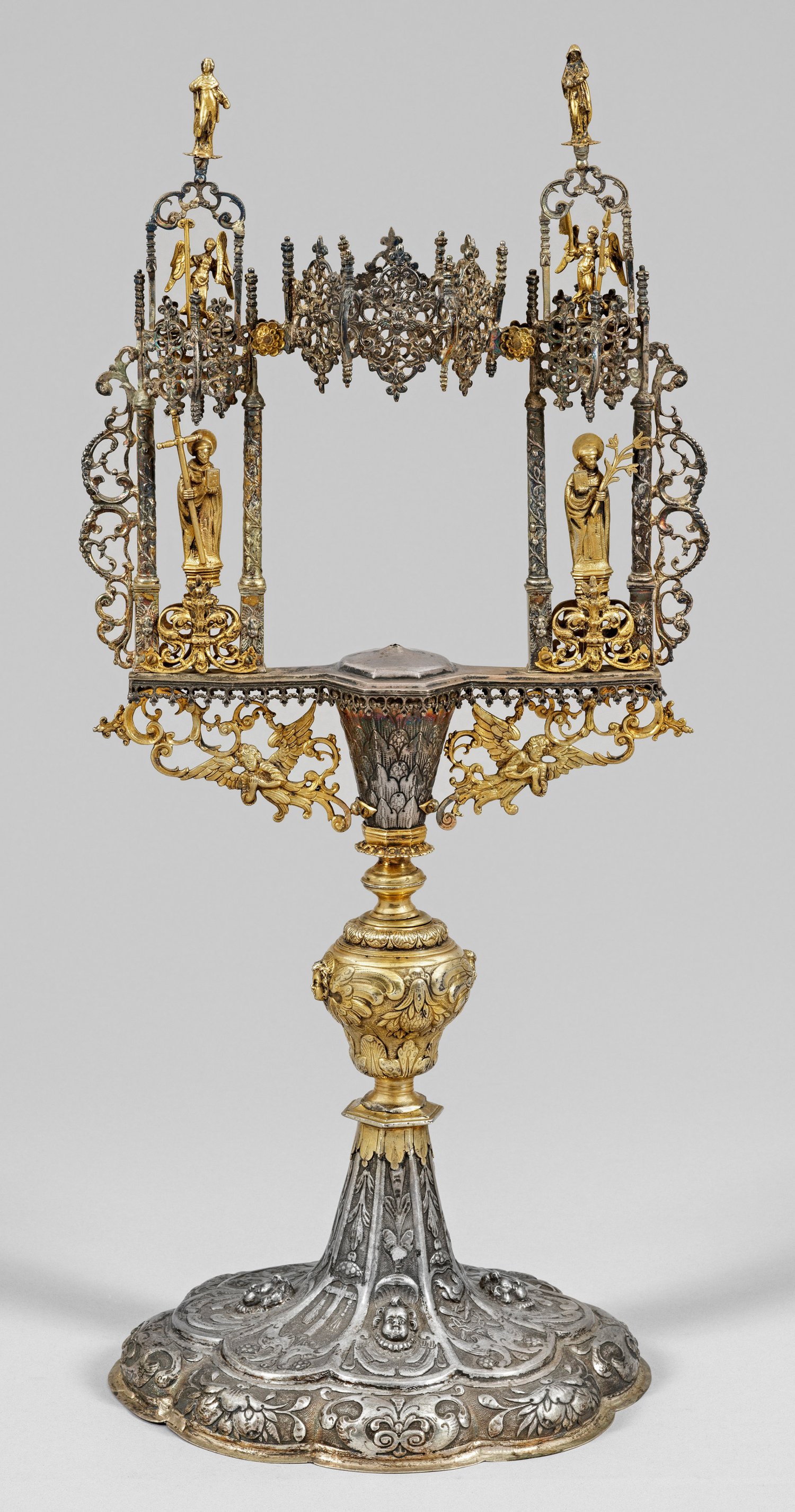 Silber, teilw. vergoldet. Blütenförmig geschweifter, zur Mitte hin aufgewölbter Stand mit schmalem, ausgestelltem Standring. Der Stand flächendeckend verziert mit Früchtebuketts und Voluten. Umlaufende Darstellungen der Marterwerkzeuge mit gekreuzten Peitschen, Lanzen, Geißeln und der mit Essig getränkte Schwamm alternierend mit reliefplastischen Engelsköpfen. Kurzer Balusterschaft, gegliedert durch einen stark bauchigen Nodus korrespondierend verziert mit Engelsköpfen sowie Blattwerk. Darüber der architektonisch aufgebaute Monstranzkorpus, bestehend aus filigranen, durchbrochen gearbeiteten Ornamenten zwischen Säulen, Streben, Fialen und Baldachinen als Rahmung für das ursprünglich zentral befestigte Expositorium, fehlt. Die seitlichen Säulen werden geziert durch vollplastische Darstellung eines Heiligen mit Buch und Blumenstängel sowie eines mit Buch und Kreuz. Darüber je ein Engel mit Märtyrerpalme und Essigschwamm bzw. mit Geißel und Lanze. Als Bekrönung die figürlichen Darstellungen von Johannes und Maria. Rest. und besch.; Gew. ca. 2170 g. H. 62 cm.
