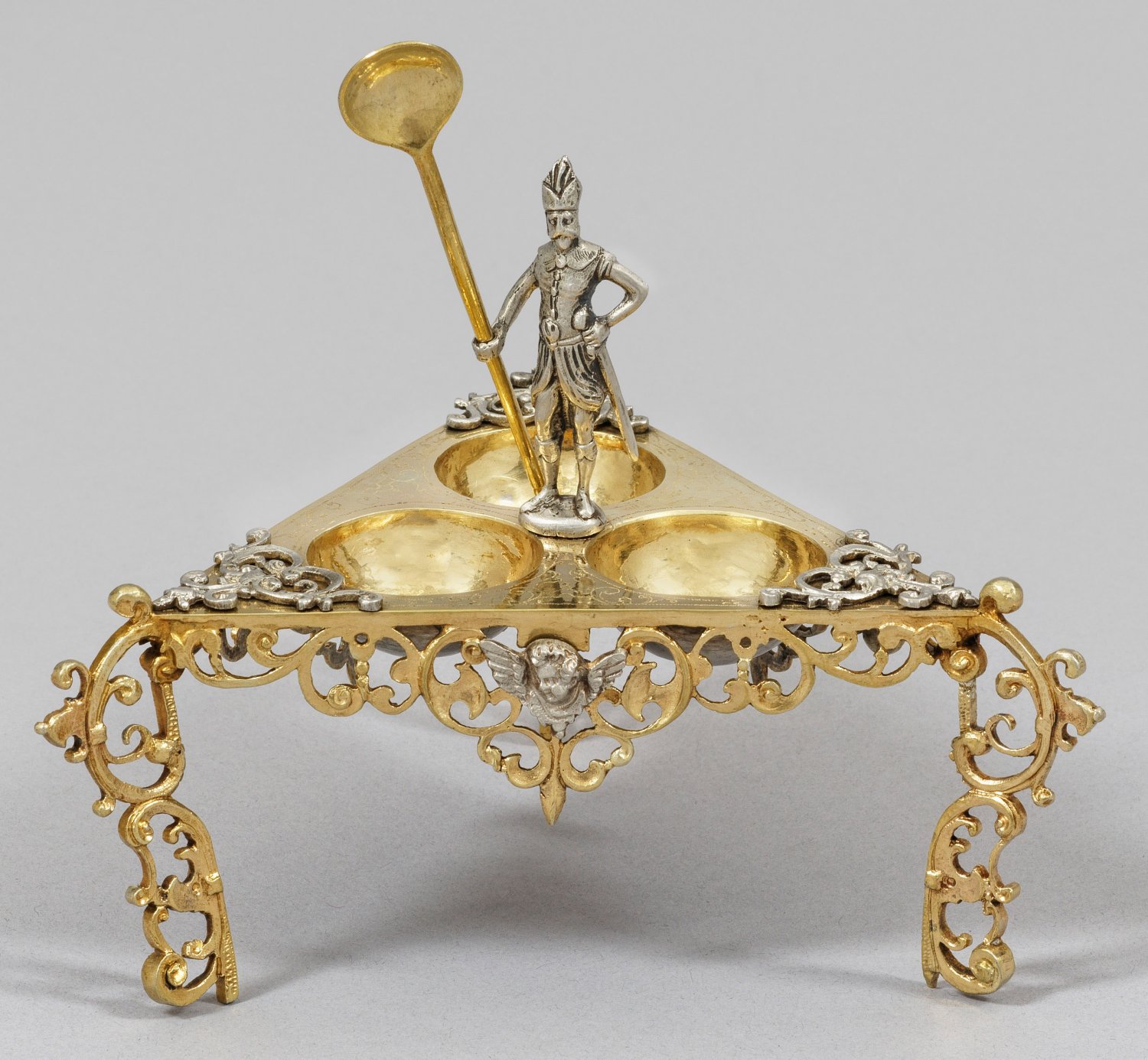 Silber, teilw. vergoldet. Drei aus Voluten geformte Beine. Dreieckiger Korpus, dreifach gemuldet und besetzt mit reliefplastischen Voluten und seitlich mit geflügelten Amorettenköpfen verziert. Mittiger Griff in Gestalt eines Mannes mit Turban und Schwert als Halter für kleinen Löffel. Gest., Beschauzeichen, unbekannter Meister "CS". Gew. ca. 135 g. H. 12,5 cm.