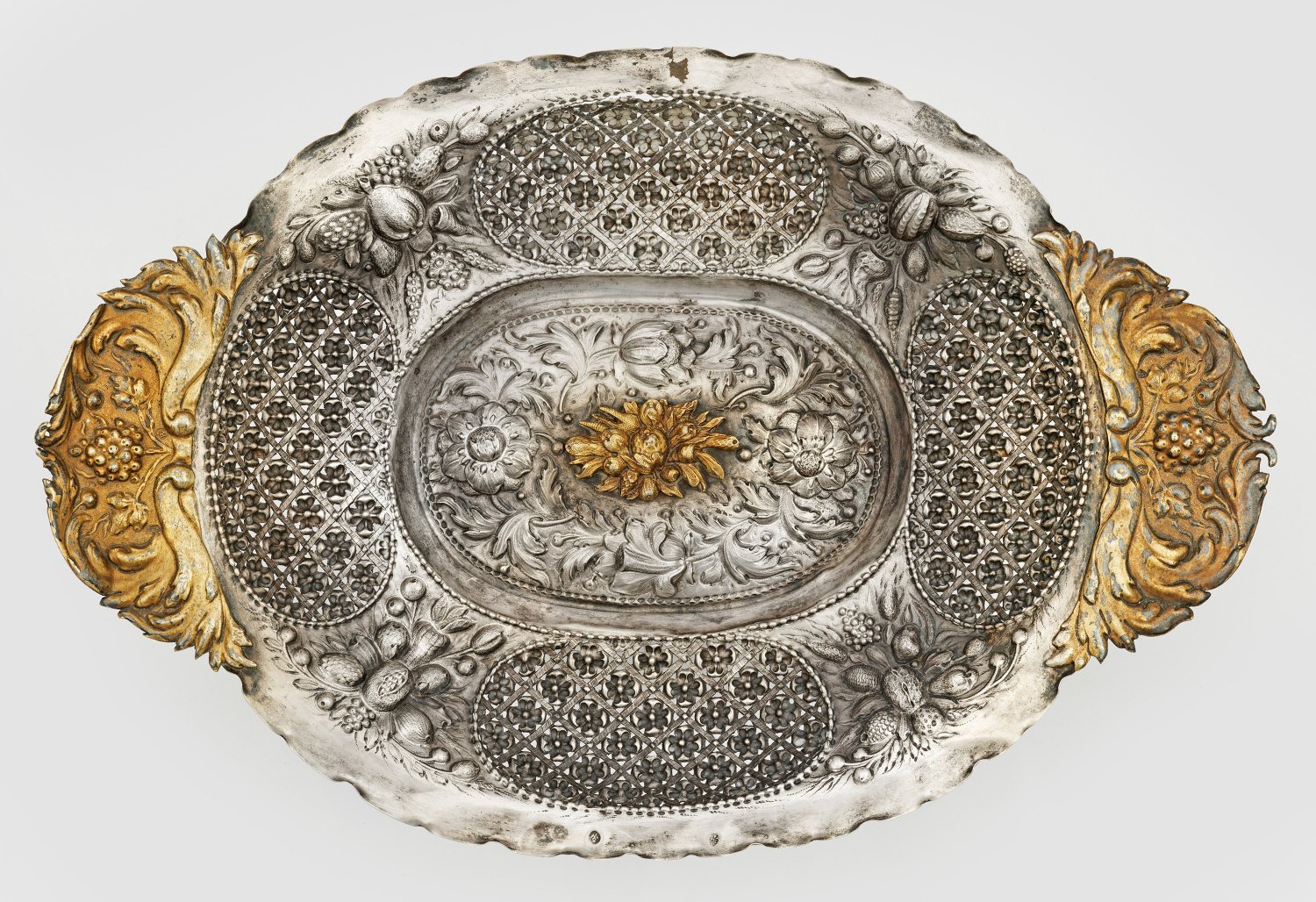 Silber, teilw. vergoldet. Ovale Form mit seitlich montierten Handhaben. Glatter, wellenförmig gekniffener, ausgestellter Rand. Im vertieften Spiegel eine aufgewölbte Kartusche mit getriebenen, reliefplastischen Barockblumen und zentral montiertem Früchtebukett, umgeben von vier weiteren, gitterähnlich, in Form von Blüten durchbrochen gearbeiteten Kartuschen und reliefierten Früchtebuketts. Die Handhaben mit üppigem Trauben- und Akanthusblattdekor verziert. Minim. besch.; Gest., Tremolierstrich, Beschauzeichen, Meister Johann Baptist I Weinold/Weinet (wird Meister um 1628). Gew. ca. 430 g. 41 cm x 27,5 cm.